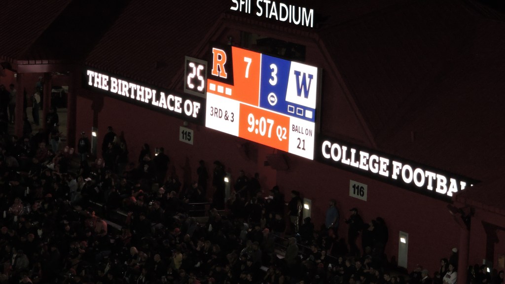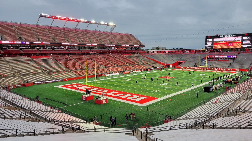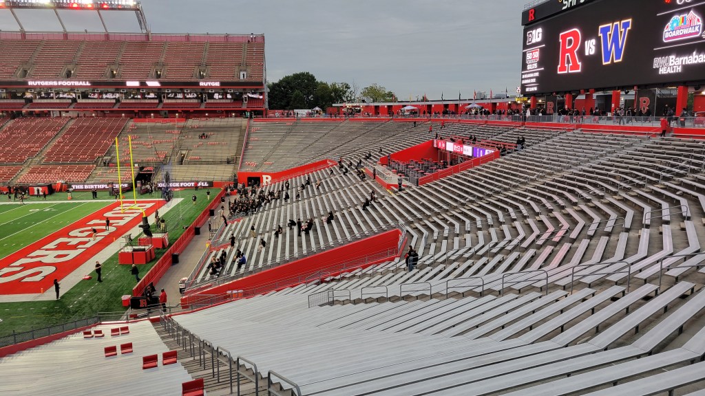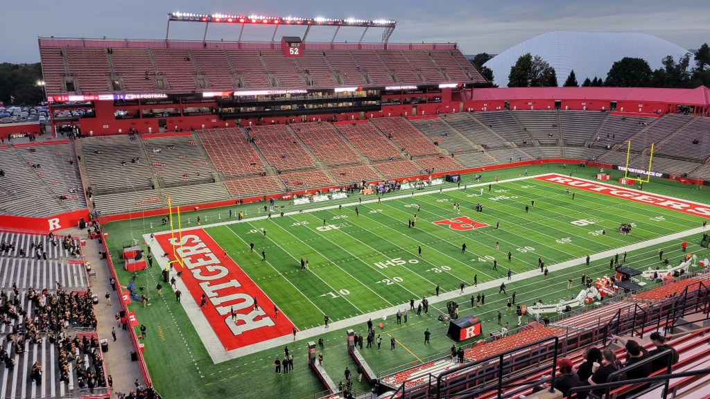 Within New Jersey, there is a definitive “North” and “South”, while “Central” is a source of argument as to where the vague line is (and if there is one). I argue that Middlesex County is in Central Jersey and that is where you can find the State University of New Jersey, better known as Rutgers. More specifically, the Piscataway-New Brunswick area is home to the sprawling campuses of the huge school, which has over 40,000 students. Football has a long history here, as it is known as the “Birthplace of College Football” since the first official game was Rutgers vs Princeton in 1869. Despite the deep history, much of it has been ugly as consistent success has often eluded the team. It was not until the 2000s when Greg Schiano took over, that things turned around. There was a run of five straight bowl appearances (4-1) and the most famous Knights season came in 2006. They went 11-2 that year and were undefeated late into the year as the home win over #3 Louisville was the defining game in the program’s history. Since moving to the Big Ten in 2014, it’s been an uphill climb as the team hasn’t come close to a conference .500 record in the first decade. My two visits were eerily similar as they both came on a Friday Night in their first conference game of the season with Schiano as coach (2010 first stint and 2024 in his second go around). Rutgers Stadium was built in 1994 and underwent a ridiculously expensive $102 million expansion in 2008-2009. Subsequent corporate name changes have followed. Overall, it’s a nice facility that proudly displays the team red colors.