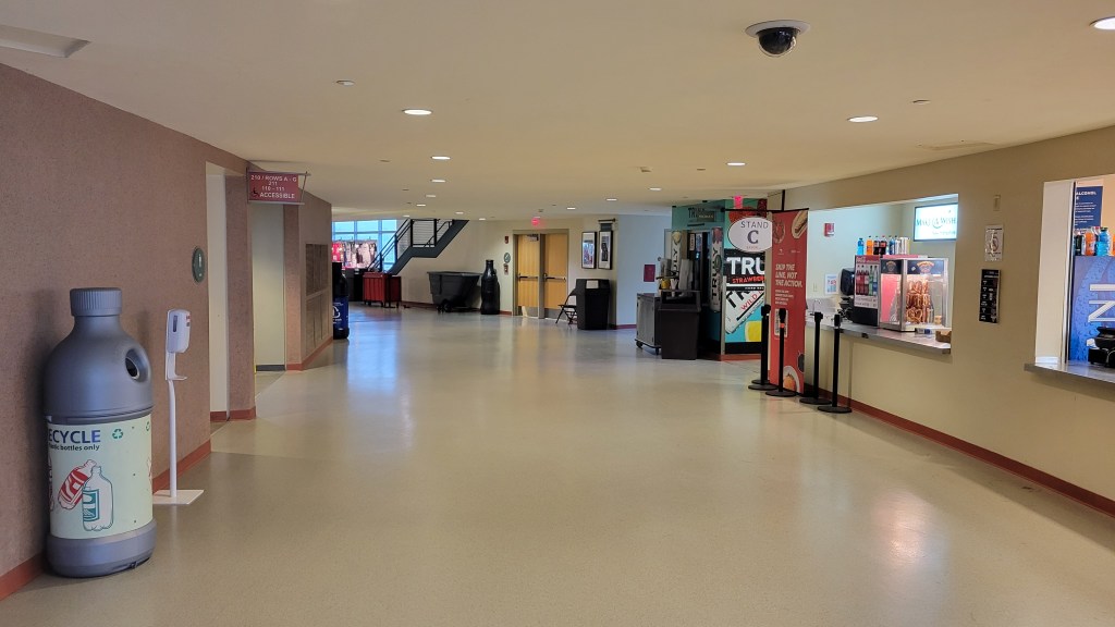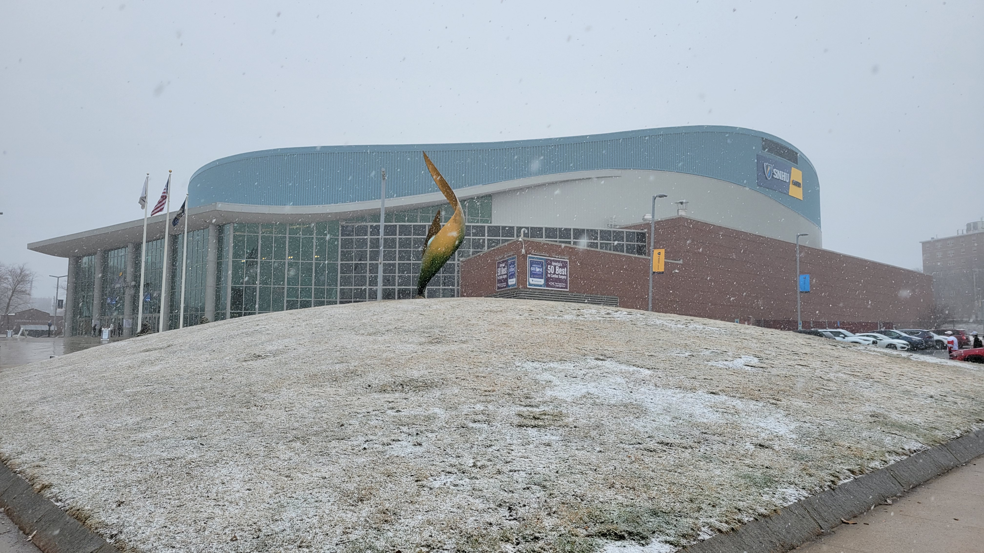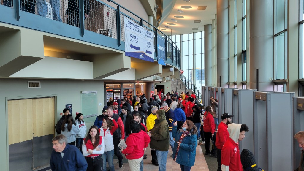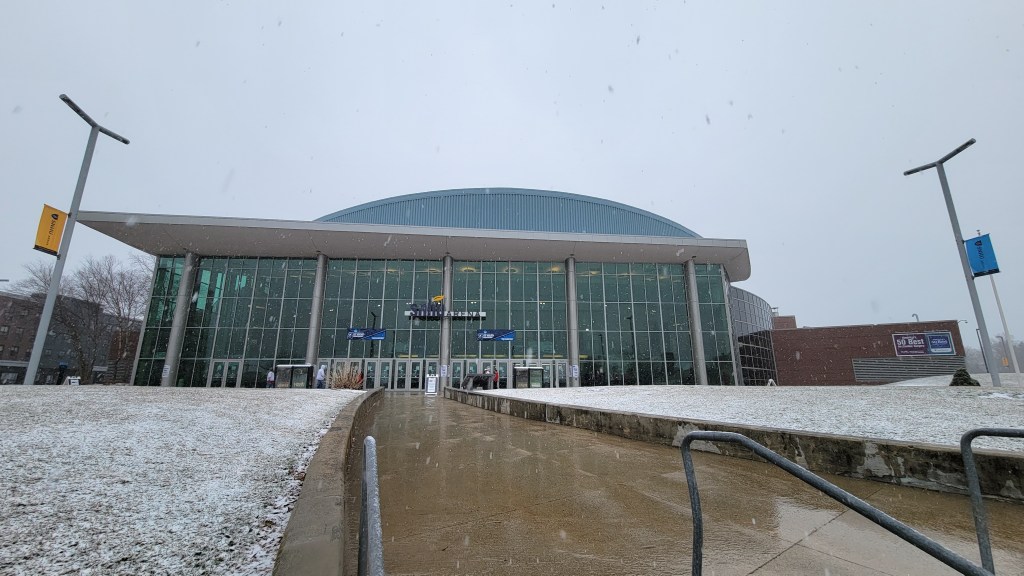 Even though the institution’s name is on the facility, none of Southern New Hampshire University’s (SNHU) athletic programs play home games at the arena…..This is a cashless facility, an annoyance for old farts like me…..Sometimes the city is referred to as “Manch” or “ManchVegas”…..Right when I began my walk to the arena, it started snowing hard. While this only lasted an hour or two, it was poorly timed as the snow was very wet. I spent a few minutes in the bathroom at the hand drier trying to clean up my jacket and jeans, along with hoping my phone wasn’t damaged while trying to take exterior pictures (it wasn’t, I just got a warning for moisture)…..If you ever have a chance to watch a tournament game, stick around afterwards. For passionate sports fans, it’s rewarding to see not just players, but staff, front office, broadcasters and student workers bask in the win for the team they follow all year. I loved watching the BU student broadcast team and the joy amongst them after the win.