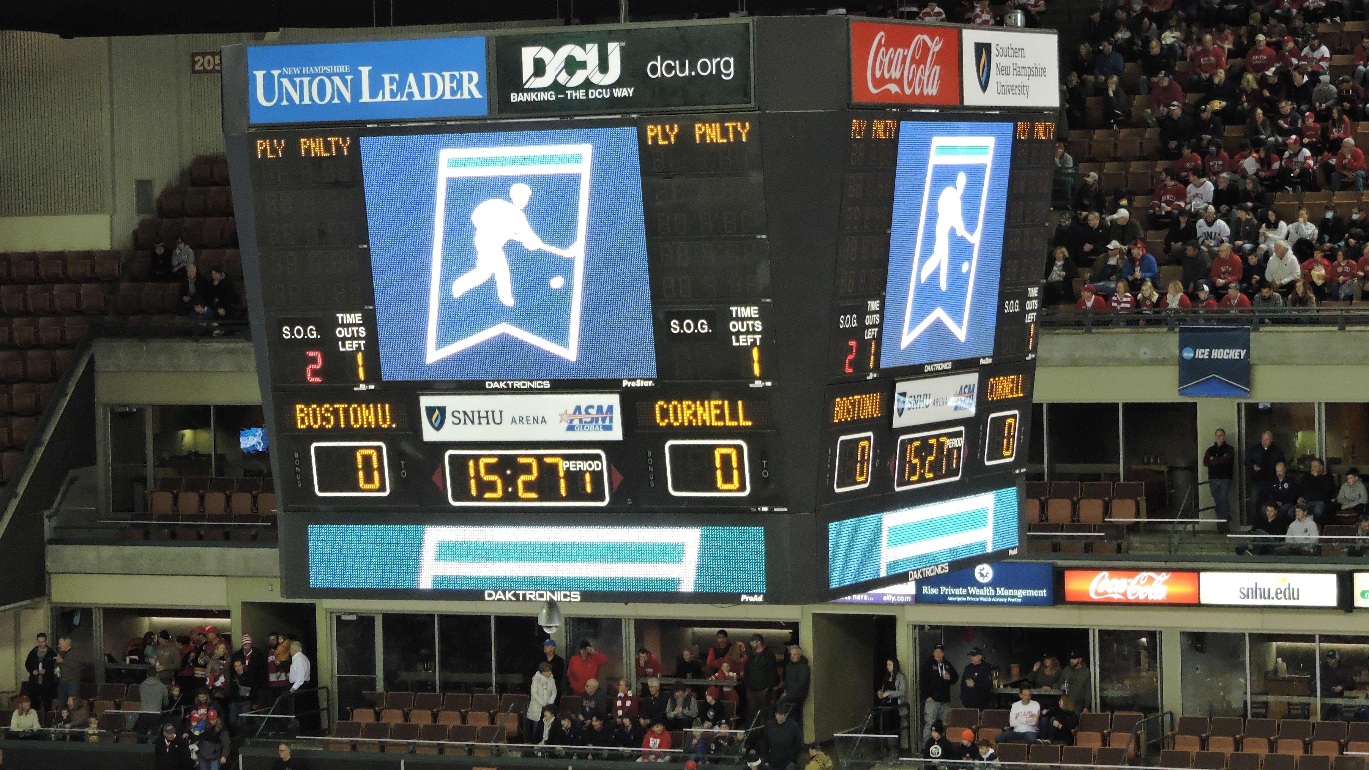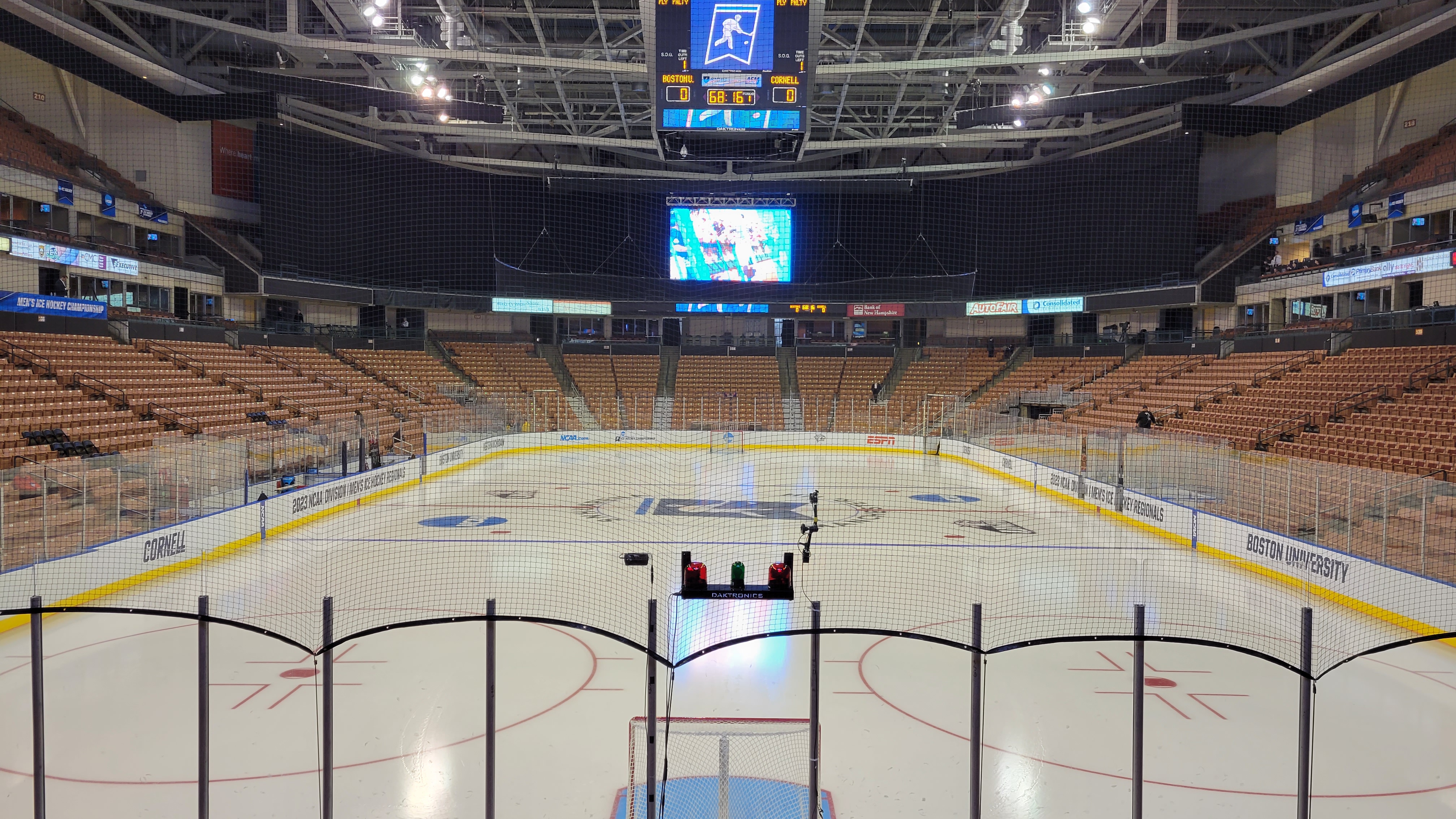 Above center-ice is a four-sided scoreboard that looks like it is older than the 2001 date of the building opening. It features an old-school dot matrix display with the score and time at the bottom of the panel and penalty information on the sides. The center graphics remained static on an NCAA Hockey logo the entire time. For video to be shown, a large screen was displayed at the top of each end. These may be temporary for the event and it was welcomed as I was happy to see something showing replays. NCAA Promotional videos were shown before the game and at intermission.