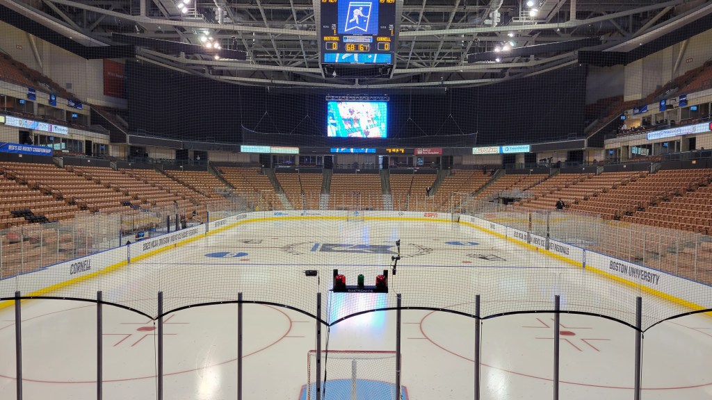 While Manchester supports the tournament well, attendance is solely dependent on the proximity and popularity of the team’s playing. Time and Day is important too. A game with Denver and Western Michigan (the first Regional Semi) that took place Thursday Afternoon understandably drew very poorly as maybe 1,000 were on hand. The Regional Final that I saw had the perfect ingredients for a big house and it delivered. A Saturday 4:00 PM game featured Boston University (an hour away and a prestigious program) and Cornell (6 hour drive, but with a passionate fan base). The announced paid attendance of 7,143 seemed about right. I would say that the crowd was made up of 65% BU fans, 25% Big Red fans and 10% neutrals. Given that half of the teams in Division 1 are within driving distance to Manchester, it’s a good place to stage an event.