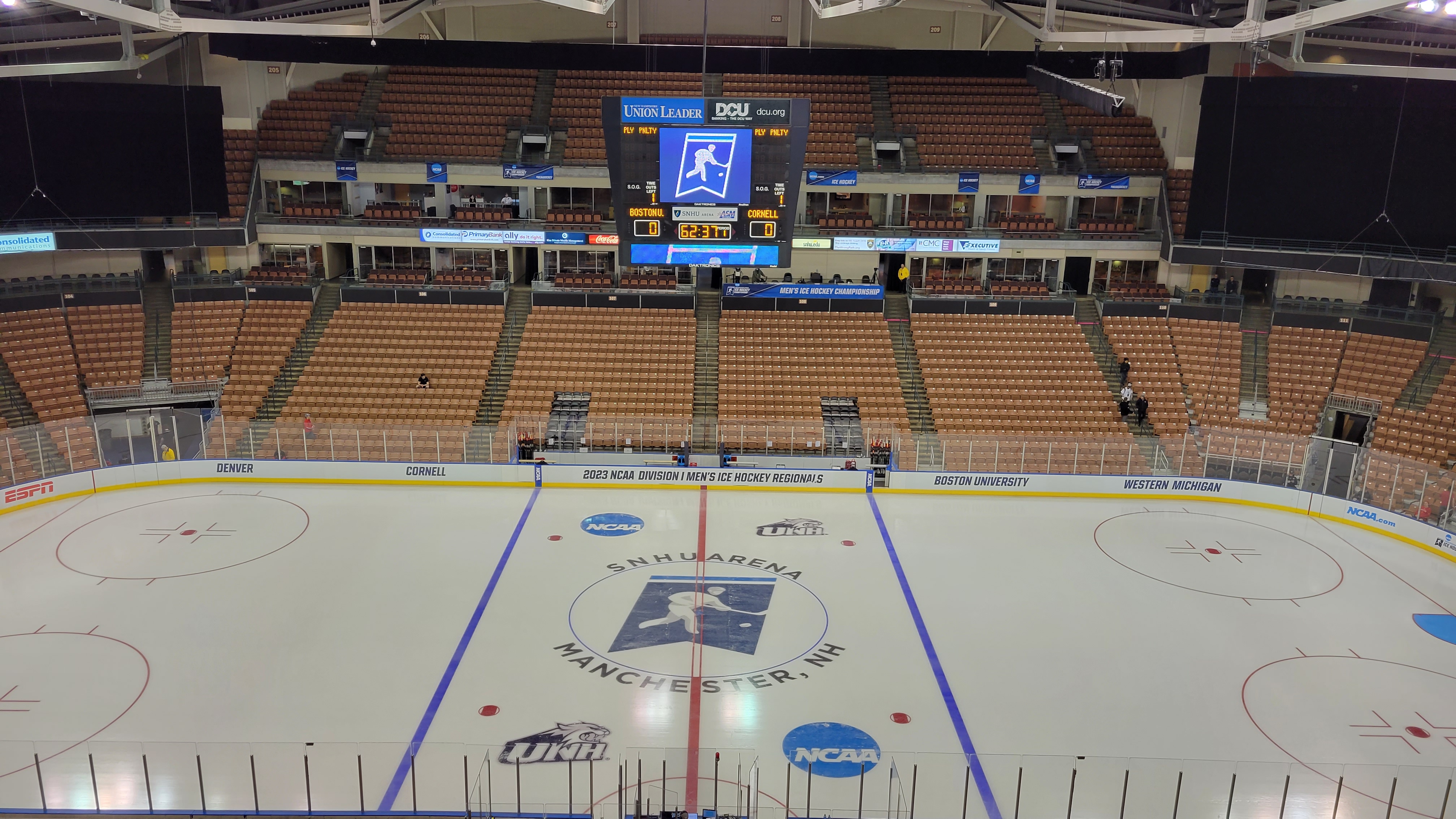 The second leg of a hockey doubleheader brought me to the Queen City, where I didn’t come to watch the local team (they don’t have one anymore), instead enjoying neutral-site playoff action. Manchester is the largest city in the Granite State with a population of around 115,000 and it is located in the southern part of the state, along the Merrimack River. The former mill town still has evidence of its past history as long, brick red buildings complete a section along the river. These buildings have been renovated for condominiums or businesses and a few blocks away, downtown has become more friendly and inviting to visitors. Before naming rights were sold to a local college, this arena that opened in 2001 was home to an AHL team who did pretty well in town. The LA Kings moved them to California in 2015 as part of the league’s western movement and the ECHL team that arrived in Manchester was a failure as fans did not warm to the team. Now, the arena has gone without a tenant for several years, but it is home to tournament hockey as the State High School Championships are held here and a more known entity is the NCAA Men’s Division I Hockey Tournament. The 16-team event begins with four 4-team Regionals and Manchester has been a host site every other year for a few decades now.