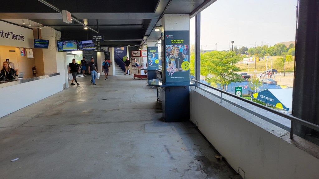 Driving in and around Toronto can be a nightmare as construction and often heavy traffic takes a toll on drivers. Getting to the tennis center from the heart of the city will likely be a pain and it’s definitely worth considering taking the Subway. Operated by TTC, the Pioneer Village station on Line 1 takes about 40 minutes from downtown’s Union Station. It’s then a 10-minute walk from that TTC Station to the entry gate. Now if you are coming from other places in Ontario (or the States), driving might be the better option, it just comes with pain points. Sobeys Stadium is just a few minutes from the Jane Street Exit off Highway 407. This leads to a streamlined, simple entry, plus the 407 will avoid a good amount of traffic. It comes at a price though as it is a toll road where costs can get as high as $30 – $50 when entering from Burlington. Our long travels made us bite the toll bullet. At least it was quick and easy. The other route is getting on Highway 400 (also close to the Tennis Center) via the more congested 401 and 403. This was our route home and even at 10 PM, it was full of cars. The several large parking lots near the stadium require passes ahead of time (these may be incorporated into your ticket), otherwise the lone drive-up and pay lot is the TTC one north of Steeles Ave. The day we came had mysteriously free parking. From this lot, it is a looong 20-minute journey along a pathway to the stadium.