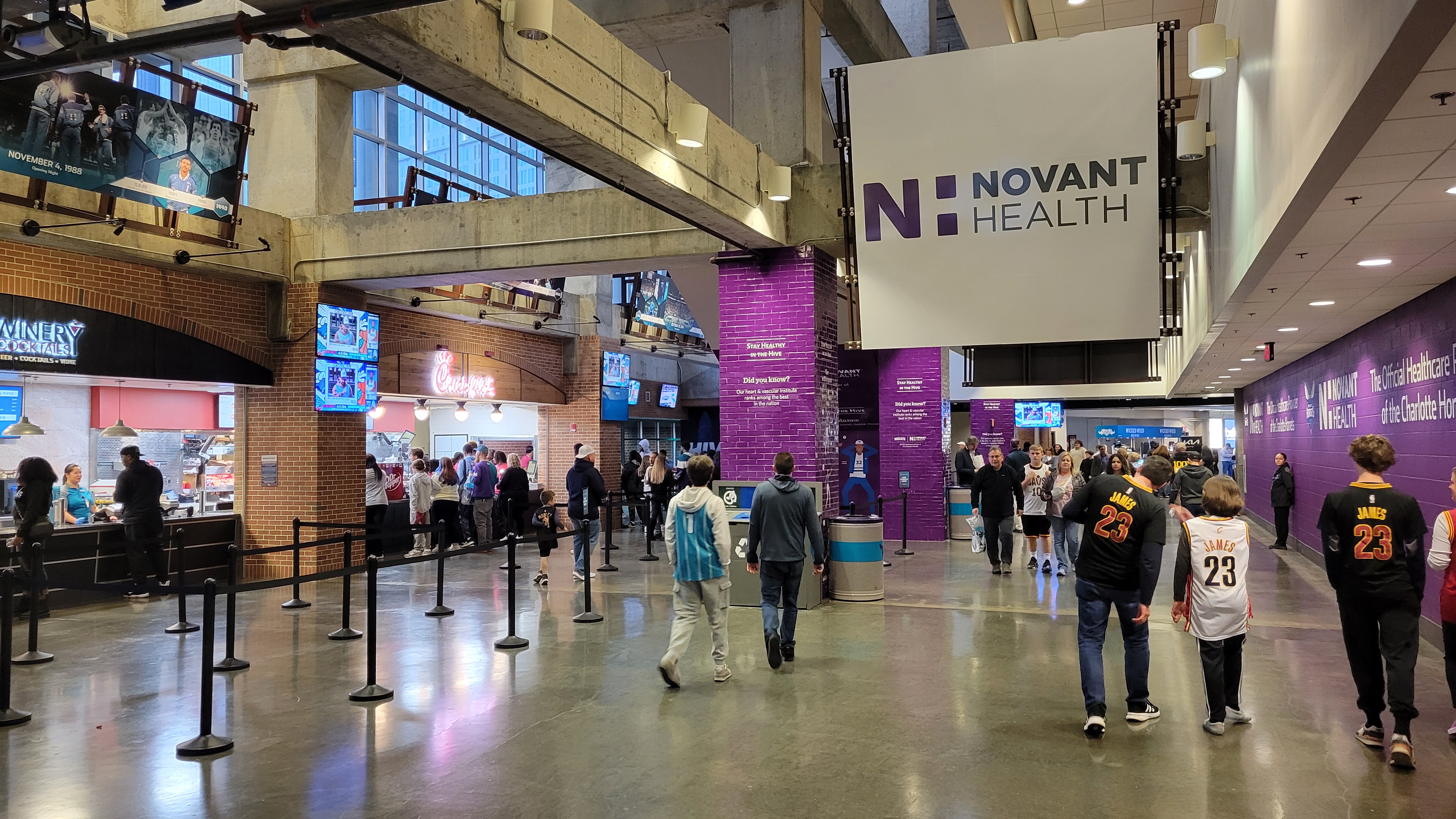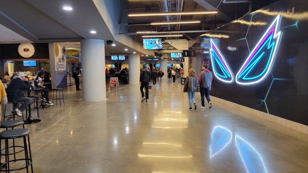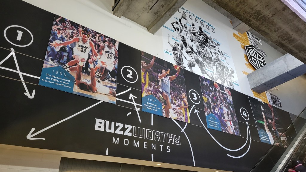 I really don’t understand “art”. The plaza in front of the main entrance feature these tall columns that are made of brick, what look like swim tubes and then odd light fixtures. It’s supposed to represent the rich textile industry and create a sense of identity. Apologies as I don’t want to disparage hard work from an artist, but man, I just don’t see it and it leads to a “what are those?” as you approach. Outside of that, the Hornets theme is played up nicely here. To go along with logos and “Buzz City” signs, there’s periodic teal and purple coloring throughout the building. Interior lightning pre-game is a light mix of those two colors. Historical moments are displayed nicely on the concourse walls as randomly, you’ll find giant pictures and other minor mementos. Nothing too deeply informative, but the picture size helps. Inside, rafter banners are nearly non-existent, surprising from a player perspective but not so much from a team one. The only retired number is the #13 of Bobby Phills who tragically passed away from a car accident while a member of the team.