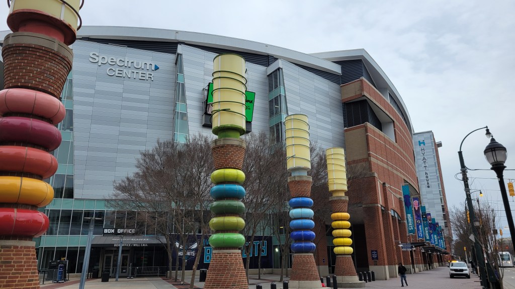 The goal of this trip was to see one of my favorite college basketball conference tournaments in Asheville. Before reaching that destination, I flew to Charlotte and spent some time in the Queen City. It earned that moniker because the city was named after Queen Charlotte, wife of King George III. More recently, “CLT” has been used as a nickname because of the airport code and this elicits a few giggles from the immature (raises hand slightly). Anyway, Charlotte sits in the south-central portion of the state in the Piedmont and with a population over 900,000, it is North Carolina’s largest city and the 15th biggest in the country. Lots of transplants come here and it is a city that is rapidly growing and expanding. Charlotte is a vibrant banking and business center, evident in the busy skyline that features plenty of tall buildings. The city’s first professional sports team arrived in 1988 as the Hornets began as an expansion team in the NBA. While at the start, they were popular even outside the area thanks to their cool teal colors and pinstriped uniforms, things didn’t initially go great on the court. Later in the 90s, the team often would finish between 4th – 6th place in the East and Alonzo Mourning / Larry Johnson / Muggsy Bogues helped field competitive teams. They never could get past the 2nd round in the playoffs though and in 2002, owner George Shinn moved the team to New Orleans. Thankfully, a replacement team followed a few years later and although Michael Jordan eventually became part of the ownership group, the team has often been terrible. Charlotte was known as the “Bobcats” for awhile, returning to the “Hornets” name in 2014 with all prior history retained. During their second stint in the city, Charlotte remarkably has made the playoffs just 3 times in 21 seasons, losing each time in the First Round. When I went to visit, the long run of ineptitude continued as they were 14-47. Games are played at the Spectrum Center, a place that opened in 2005 and replaced an arena (Charlotte Coliseum) built for the Hornets that lived for only 17 years.