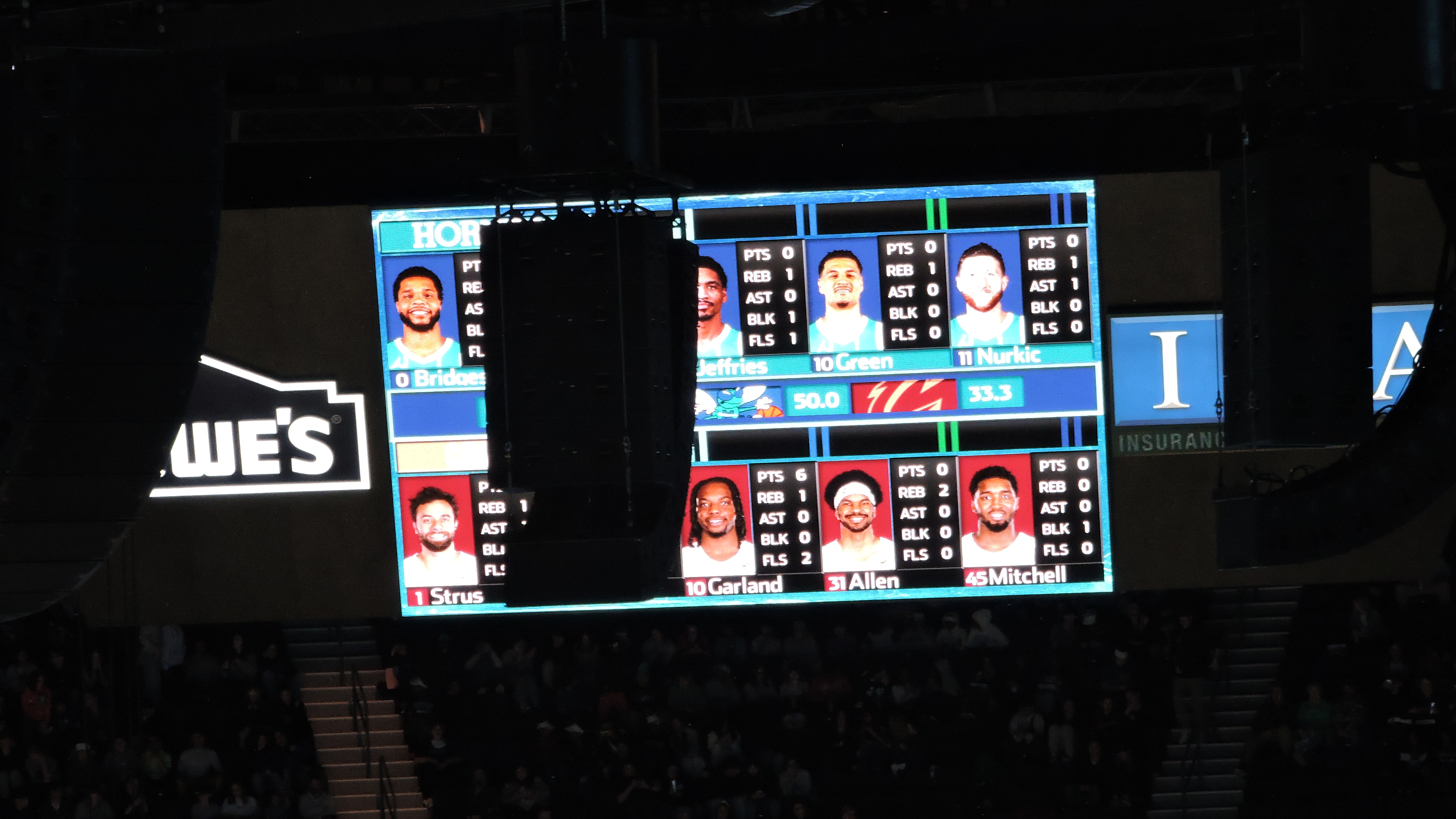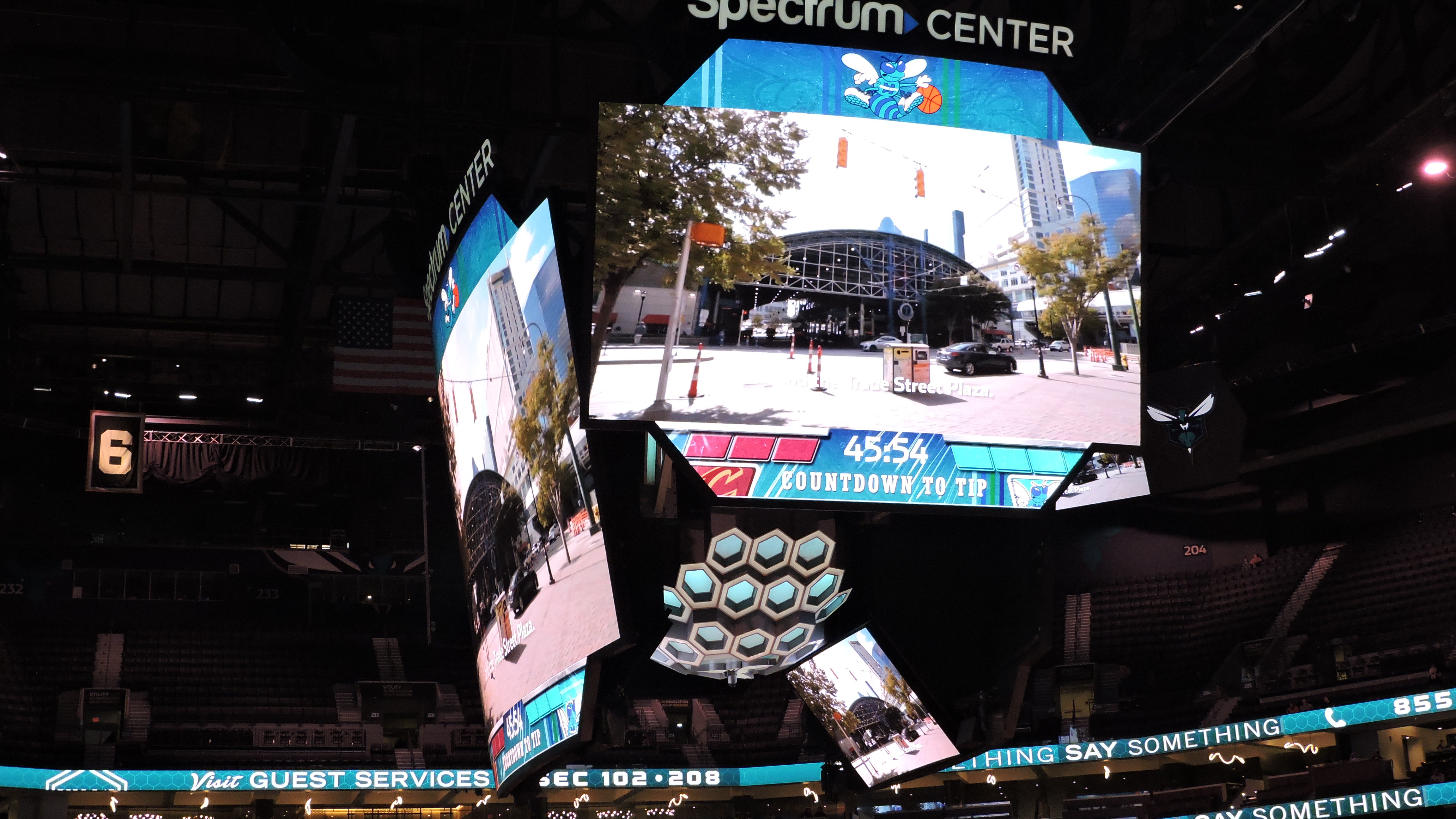 When Spectrum Center first opened, the top of the scoreboard had an incredible mural of the Charlotte Skyline. That would instantly make it my favorite board of all-time. Sadly, it’s no more as it’s gone from the current version. Not that there’s anything wrong with this one and it does have a cool hive feature on the underside. It’s a cool look for a minimally used part of the board. Otherwise, we have four video screens with the side ones being in landscape mode and featuring a brilliant picture. The end screens aren’t too shabby either in both size and clarity. In addition, four video boards are in each upper corner and they feature player / team stats. One issue is that a giant speaker was in my way for seeing the screen that had player stats.