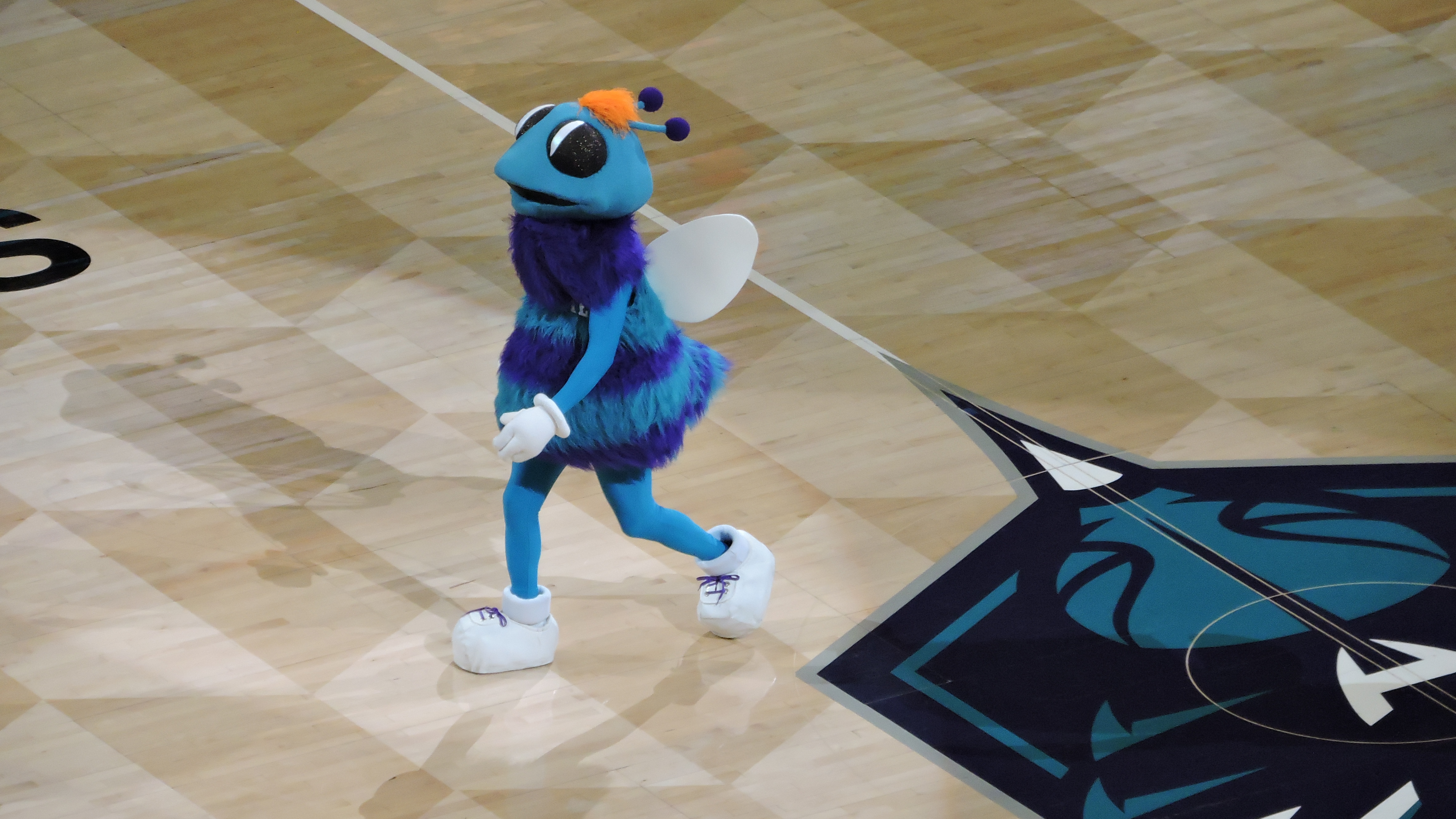 There was a guy outside the arena that was blowing long balloons for the kids, all free. A nice touch to get the little ones excited and having a good time…..What’s not a nice gesture: they confiscated my water bottle as I came in. Yeah, I know they aren’t allowed, but most times I can sneak it in…..Each stair at the beginning of a section has directional arrows for seat and section number. So helpful!……The team is known as the Hornets because the city was described as “a hornet’s nest of rebellion” during the Revolutionary War…..The now extinct Charlotte Coliseum is interesting in that it only survived 17 years and it was lauded as the biggest NBA arena ever built. Seating capacity was a whopping 24,000, yet there were hardly any money-making luxury suites, which were a thing at that point in time……Hugo The Hornet is Charlotte’s mascot and it’s a good one. Entertaining and kid-friendly. There’s also “Super Hugo”, which is a more humanized version in spandex. However, he only showed up with like two minutes left in the game.