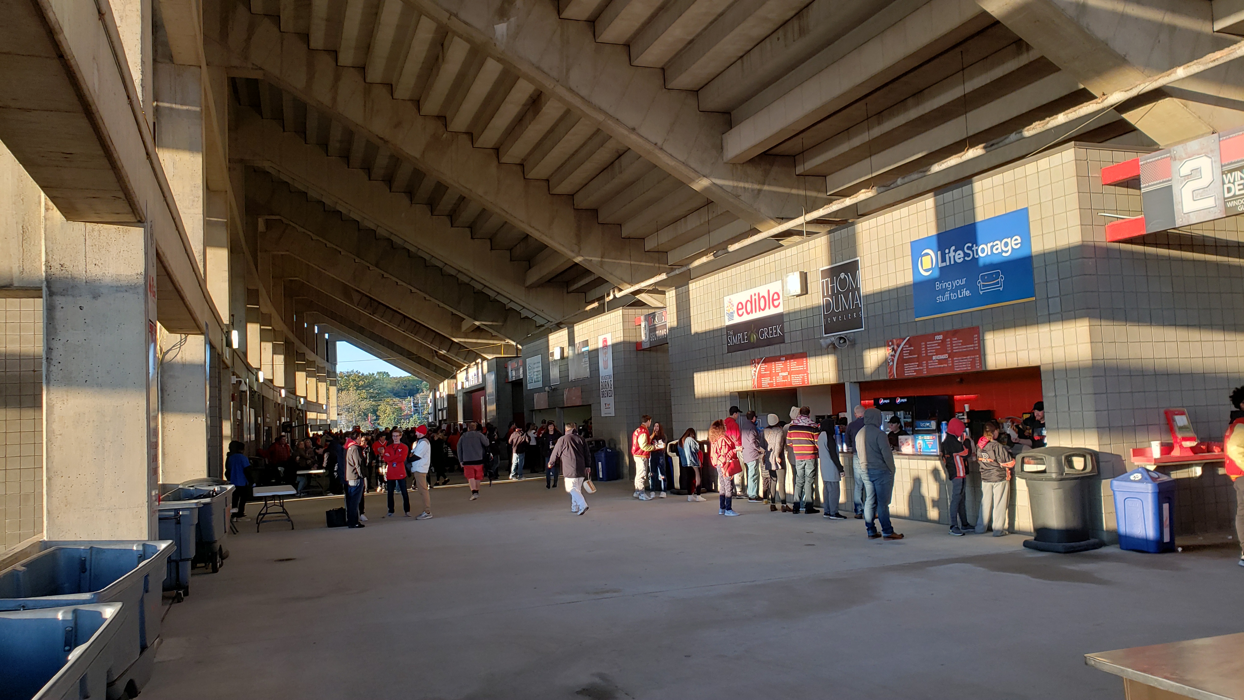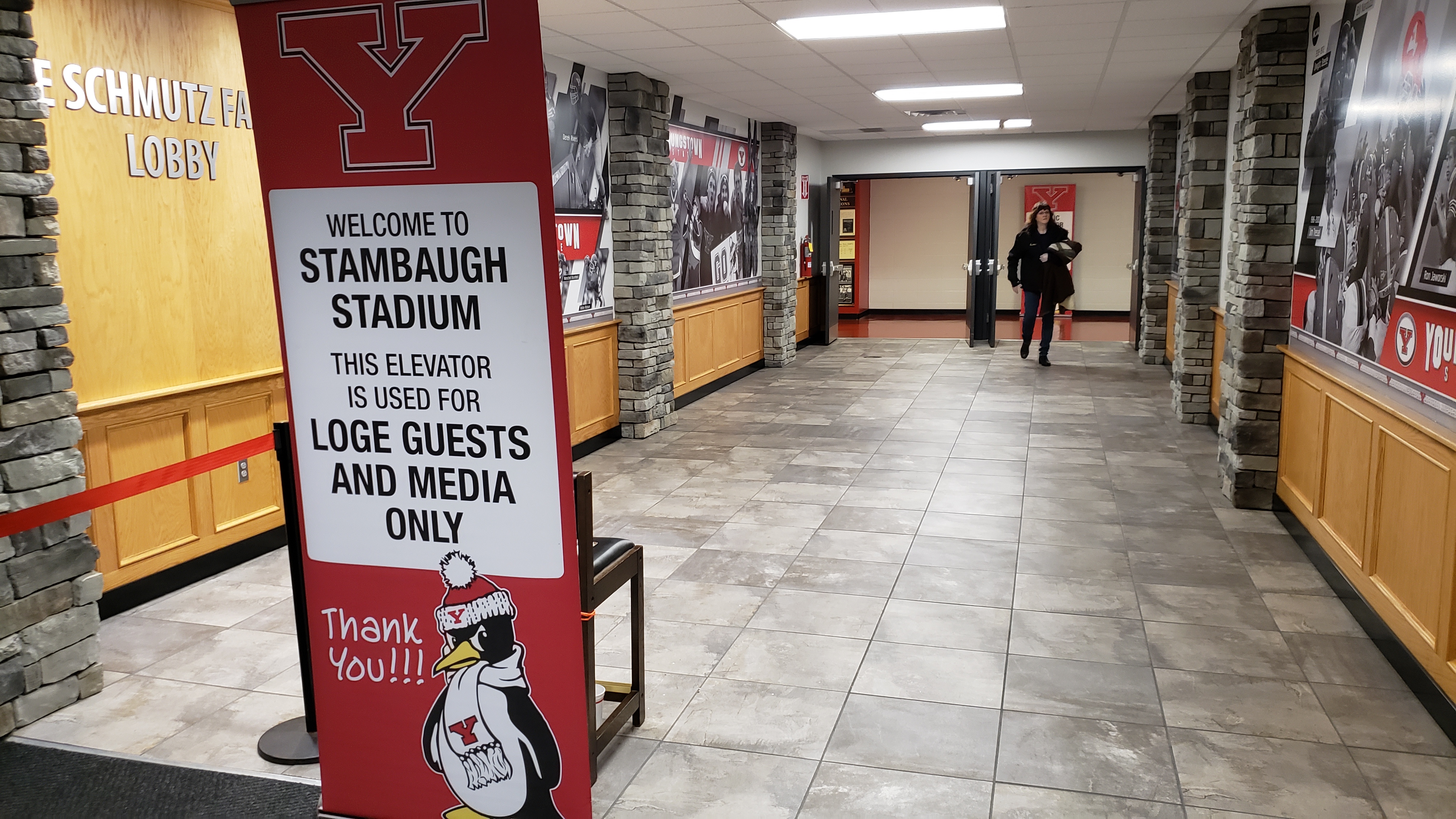 There is more misinformation from YSU as they state that you cannot move back and forth between each sideline seating section (which is stupid). However, I found that there is a small walkway behind the north end zone that does indeed connect the two seating sections. The much smaller east side has a traditional concourse, while the west side has a little more depth. Most won’t see it, but there is actually a lobby at ground-level and it features stone accents and several displays. An elevator to the loge/media level is found here and then the upcoming red hallway provides access to a large gym (completely random). You can use that hallway to reach a public elevator and that will bring you to the main, fourth-level concourse for general ticket holders. I wouldn’t rely heavily on the elevator as it is runs infrequently. Thus, many have to use a series of long ramps to reach an ancient concrete concourse that extends the length of the sideline in the middle of the bowl. How ancient? There was a campus telephone, because you know, so many students have landlines. Steps from the seating bowl loom overhead. No way can this area accommodate the roughly 17,000 that the west sideline holds, so expect a very slow go at halftime and the end of a game. Men’s bathrooms feature the always disgusting trough.