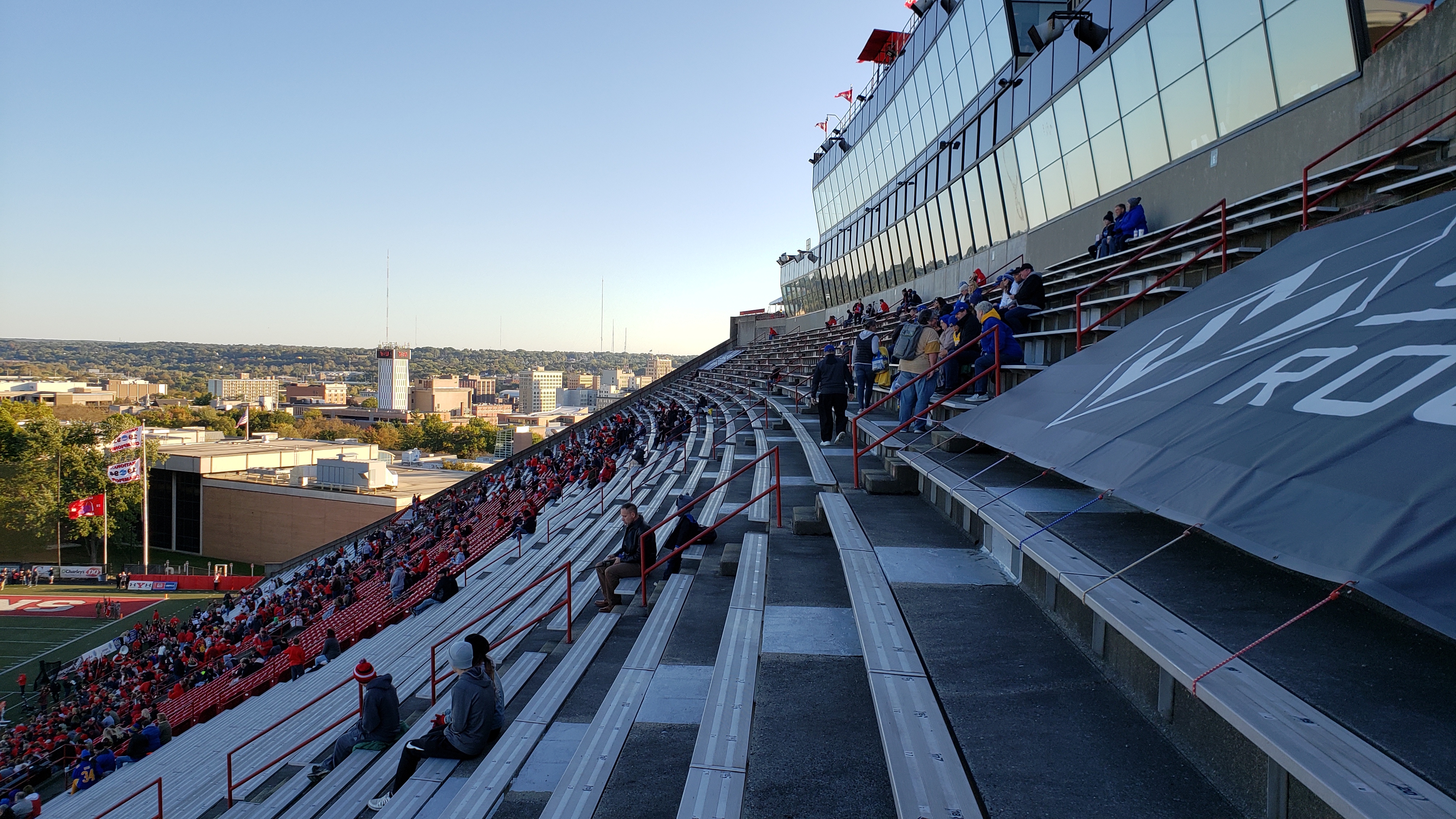 All of the seating is on the sideline and the west stands is the main one as it goes a mile up with a whopping 70 rows. It’s steep and outdated given that the steps are narrow to climb and the underside of each first corner seat featured mold on the concrete base. However, the sightlines to the field are outstanding and the view is fantastic as even in those in the middle of the bowl are treated to a beautiful panoramic of the tree-filled Mahoning Valley in the distance. To the far right is the campus and city skyline. There’s an 8-foot wall between the first row and the field, while the absence of a track allows for close proximity to the field of play. Back to the seating structure, there’s a very slight curve to it. In the middle are three sections of comfy red chairs. All other seats are metal bleachers and while the seat isn’t comfortable, the legroom isn’t bad. At the top of the west side is an enclosed stadium club that is expansive and features 26 loge sections. The other side of the stadium was constructed in 1997 and it has bleacher seating that extends to the 10-yard lines. It’s much smaller, helping to preserve the view. A walkway splits up the structure and the media box is located above the seats. Students and the band sit on this side.