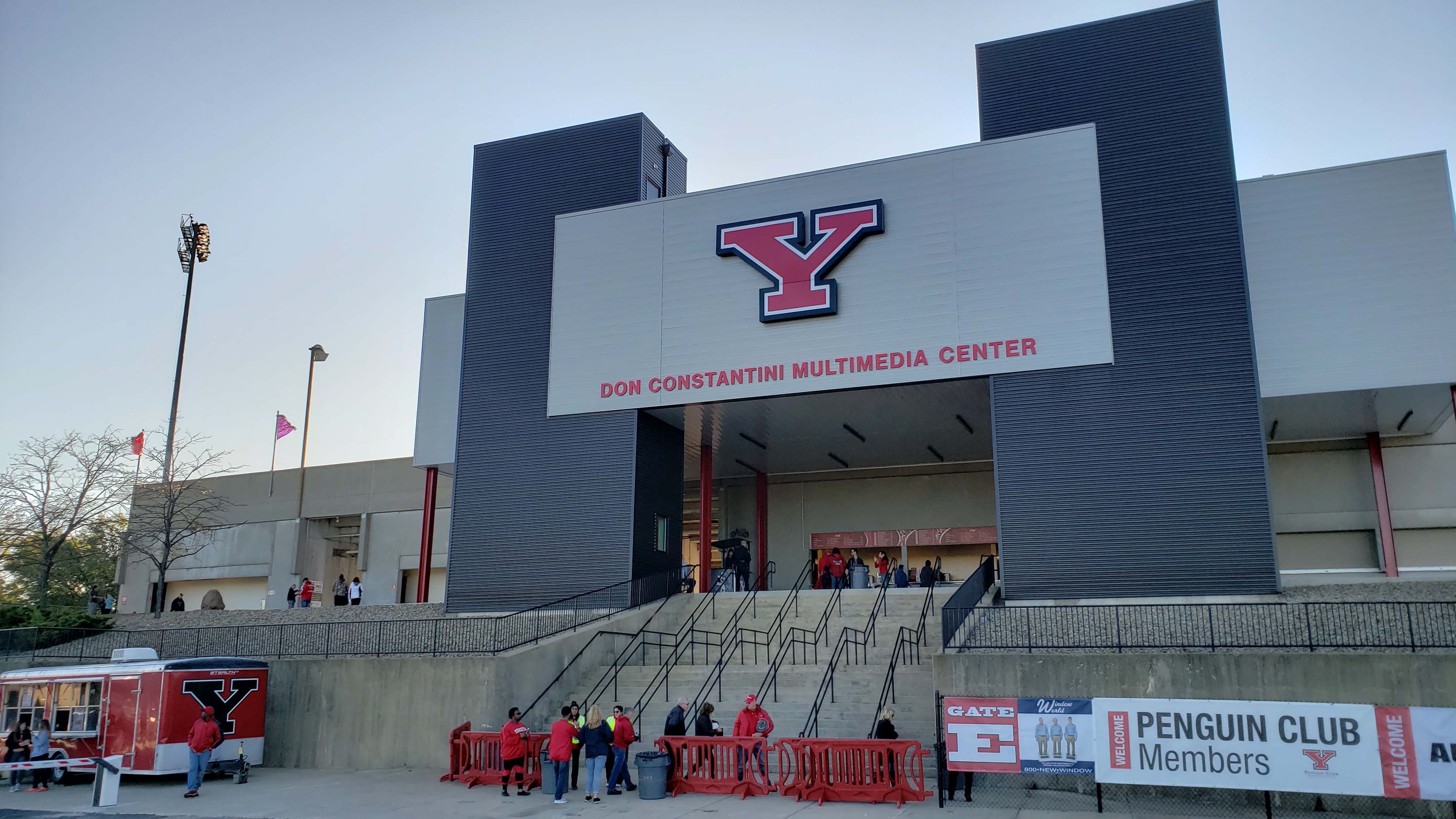 This is a unique stadium because of the hilly, geographic location. Each side has its own face and the north end is facing the highway, so you don’t get to see that unless driving by (the visual is a team mural on the back of a scoreboard). The other end is at the bottom of a hill and a rocky slope fills the space between walkway and field. The primary exterior appearance comes from the back of the west side, where the towering structure is outlined in concrete square and rectangular blocks. In fact, Stambaugh is the tallest building in Youngstown. At the top, is an out-of-place glass structure protruding outward. Some color is added by the huge vertical banners that feature the Penguin mascot and say “Y and Proud”. The other side is quite different as the new slate and silver Don Constantini Multimedia Center covers the concrete seating structure.