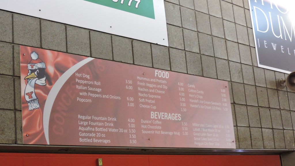 The food at Stambaugh Stadium is bland as we had a chicken sandwich that was dry and dull. Then a hot chocolate later in the night was served lukewarm. It’s mostly stadium dreck and there aren’t even any French Fries to go with Hot Dogs or Burgers. A Pepperoni Roll was the only somewhat unique thing. One positive is that they sell beer and having local breweries is an added bonus. Penguin City Beer (made in Youngstown) or a beer from Great Lakes (Cleveland) are the options.