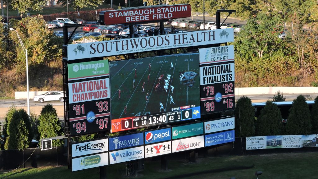 Anchoring the Mahoning Valley in Eastern Ohio is Youngstown and it was the site for our second football game of the day. As a rust belt city, Y-town has really struggled as they have lost more than 60% of their population over the last several decades. This was precipitated by the fall of the steel industry and they haven’t really recovered as only small pockets of economic success exists. Youngstown State University is a big part of the city as this public research university has 15,000 students, many of them considered commuters. Their sports teams have the nickname “Penguins” and they have plenty of football achievements with 4 National Championships at the FCS level. All of those titles came in the 90s under Jim Tressel. He’s back at YSU currently, but as school president, an unusual position for a former football coach that left Ohio State with a show-cause penalty. The ‘Guins have made 11 playoff appearances, with their most recent coming in 2016 when they made it back to the championship game. Since 1982, Stambaugh Stadium has been home and it is an old-school facility that is made better by a great view.