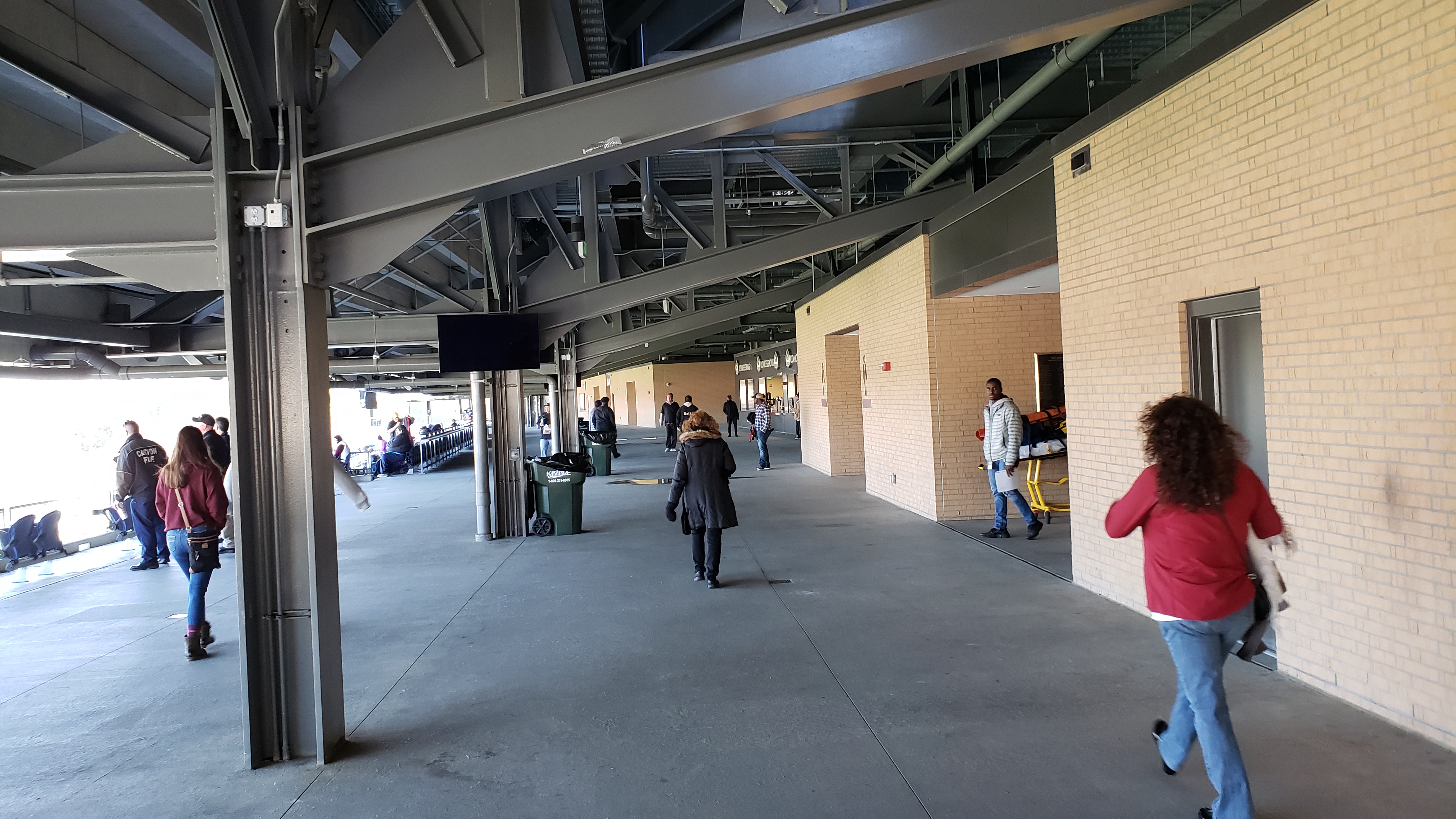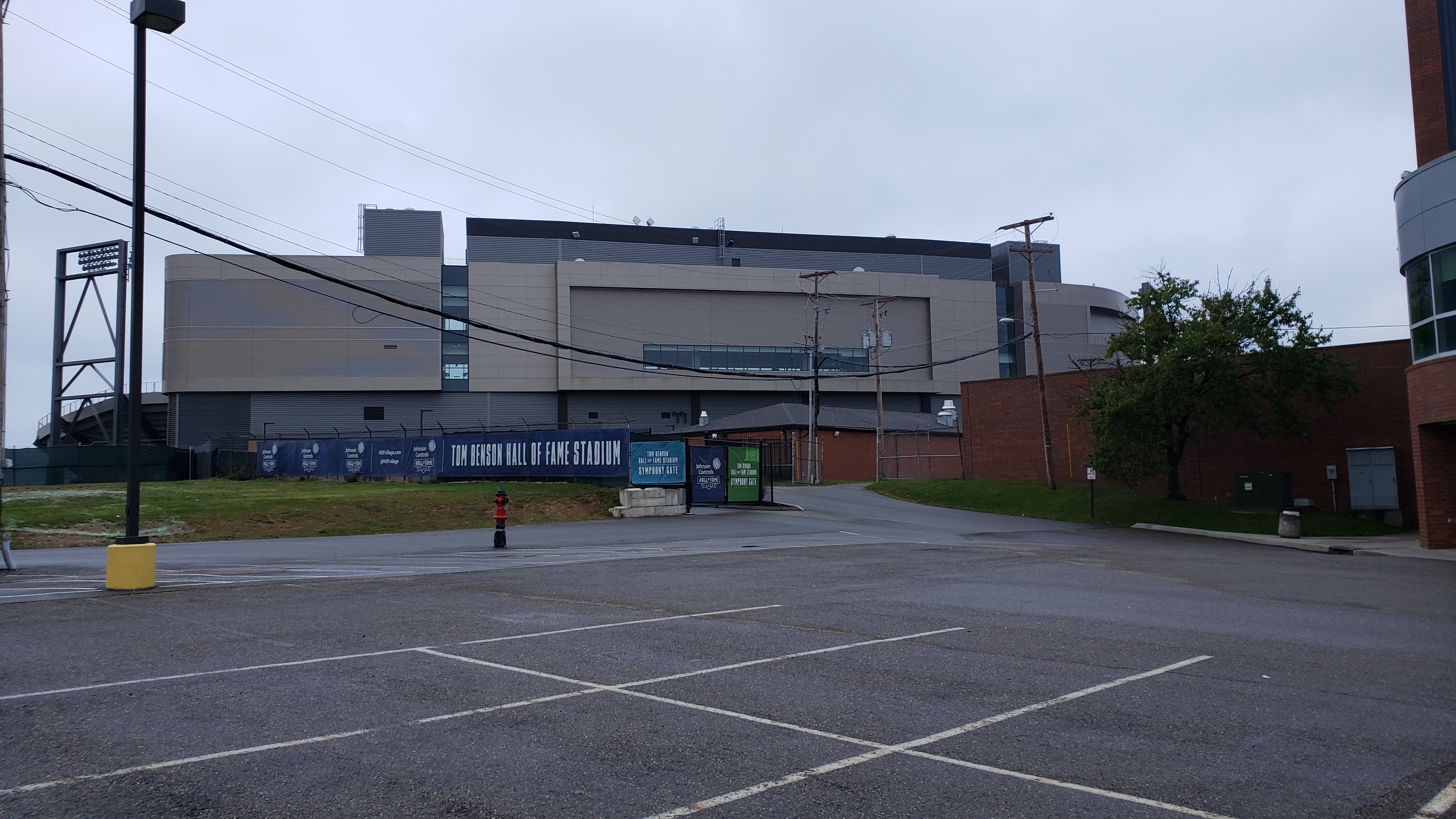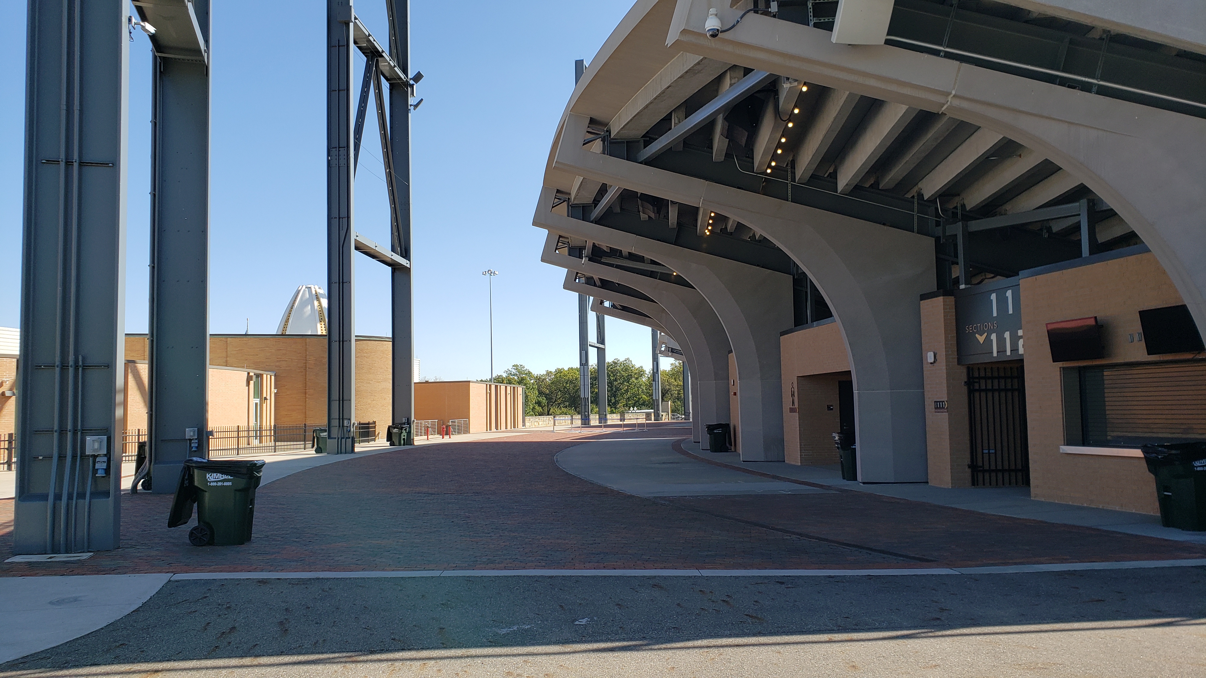 Coming from the high school lot, the exterior is surprisingly dull. Power lines and telephone poles are in the way of the gray and silver building that features a paneled look. A stadium sign that should be on the actual stadium isn’t and instead lies on a fence in front. From the other side near the HOF, you can see the back of the concrete step seating with a brick wall at ground level. The bricks are appealing with varying tan colors.