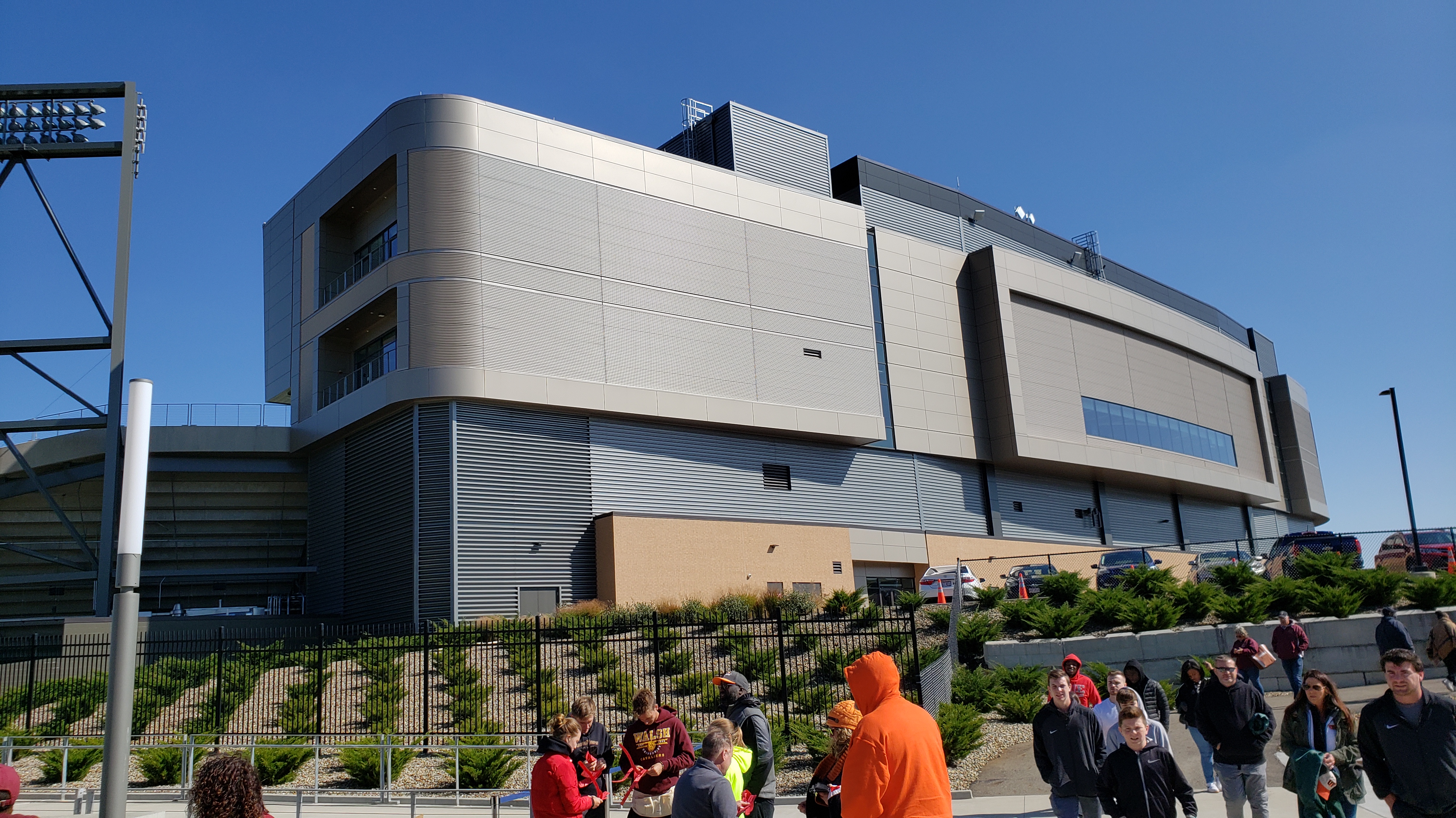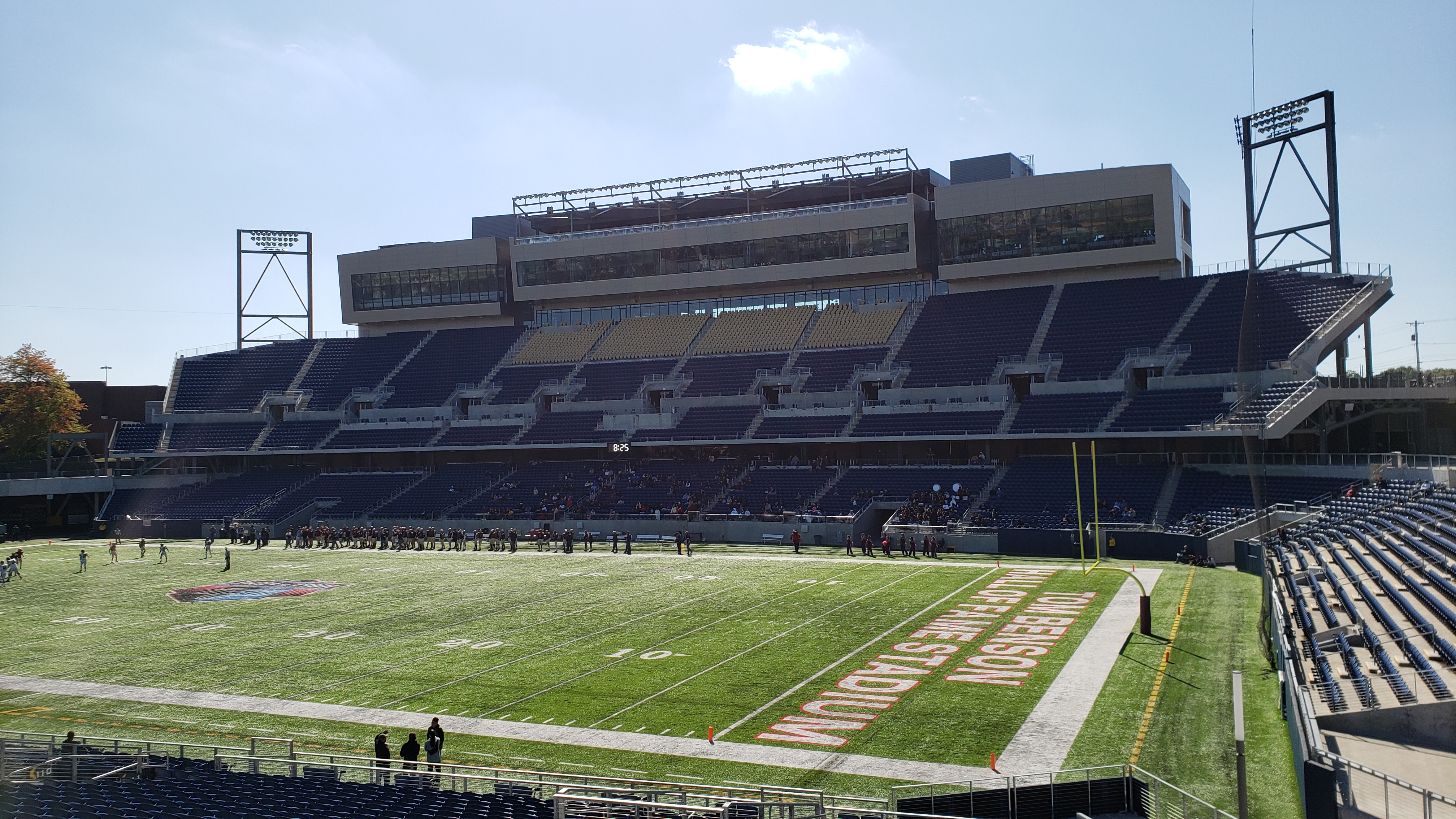 All this money and you can’t build a better scoreboard? Maybe the one in the north endzone is temporary, but for now, it is a simple black base with game information on the lower third and a graphics board/video screen above that. I’m not sure if it has video capabilities, because that was never used for the Walsh game (maybe it wasn’t broadcasted). Thus, advertisements and generic graphics were on it all game, including a curious “No Smoking” one. An annoying missing feature is that there is plenty of space on the façade of each seating bowl for vital game info, however each one only has a game clock.