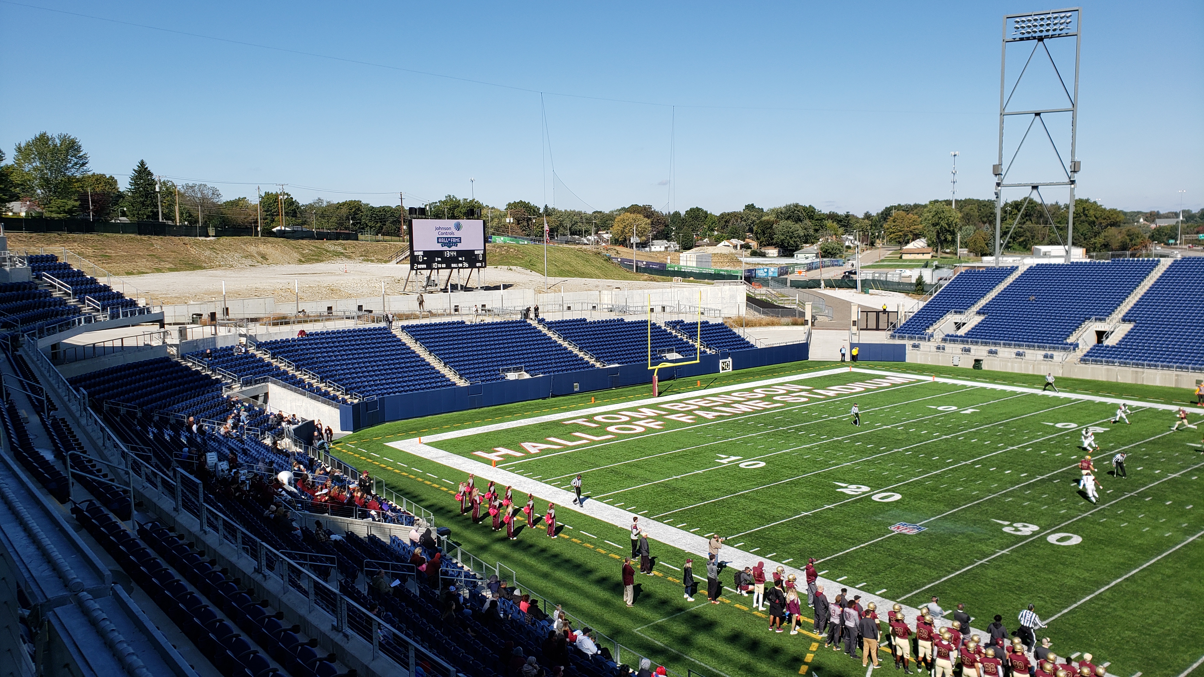 This is not just an exceptional facility for D2 football, it is a stadium that rivals any at the FBS level as well. The setting is on a hillside and the bulk of the seating is on the west sideline. Here, the double-decker structure offers optimal sightlines. Game views are relatively close and at a perfect height level with no obstructions. Unfortunately, for Walsh games, the upper deck is roped off, but I snuck up there to take a peak and the view is even better since you get to see the famous football-shaped HOF building just beyond the stadium. Rows are wide and so are the dark blue seats as they come with cupholders. The color exception comes at the top middle of the upper-deck as that is the location of the gold seats. These are reserved for the Hall of Famers on Enshrinement Night. This visual is even more evident (and powerful) when coming through the stage on the other side of the stadium. Above the gold chairs is a large, windowed building that contains plenty of amenities including clubs, lounges, luxury suites and VIP terraces. None of this is for Walsh fans however. The west stands fan out towards the corners, where they are turned towards the field and on the lower level, these seats wrap around the north endzone. After a large opening, seating resumes with the east stands. These are simpler and at a more shallow pitch, yet they’re still fine for game-viewing. One odd piece that this side contains is a temporary, middle pull-out section of seats. Reason is that they can fold up to be removed and replaced by a stage (for concerts and the induction ceremony). The south endzone is currently barren and I’m not sure what kind of construction they have planned there as the space was fenced off and dead at the time of visit.