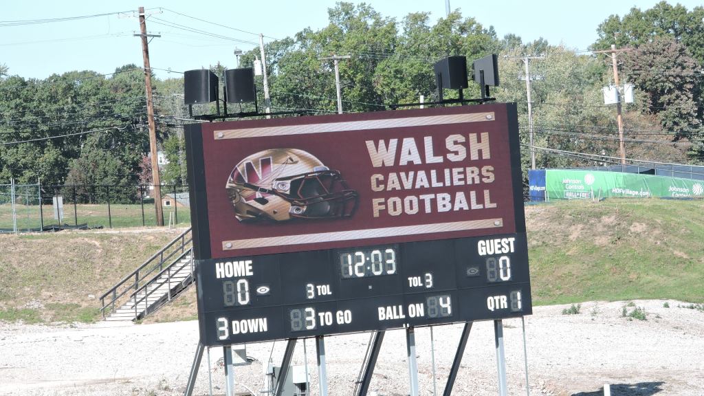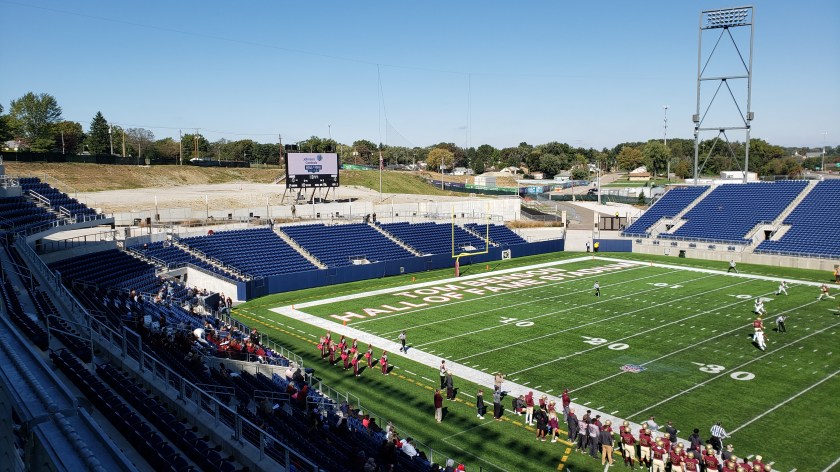 The old Fawcett Stadium was named after John, a former Canton BOE member. After the rebuild, Tom Benson was honored as he was a heavy donor for the project…..Walsh’s campus is in North Canton, about 10 minutes from their home stadium….Walsh’s league is the Great Midwest Athletic Conference, often shortened to G-MAC…..We were fortunate that the morning rain cleared for a completely sunny afternoon as that helped to stay somewhat warm with temperatures in the upper 40s. What didn’t help was the bathrooms having cold water AND cold hand dryers.