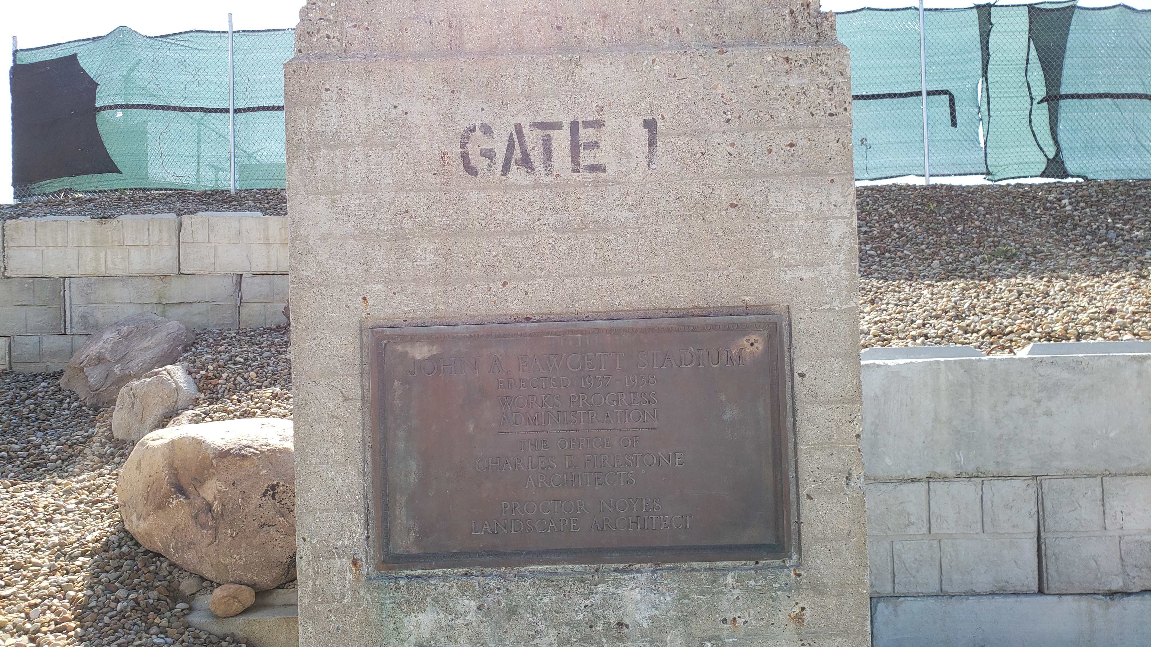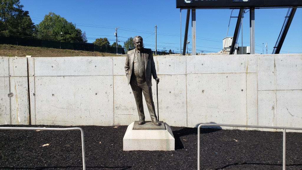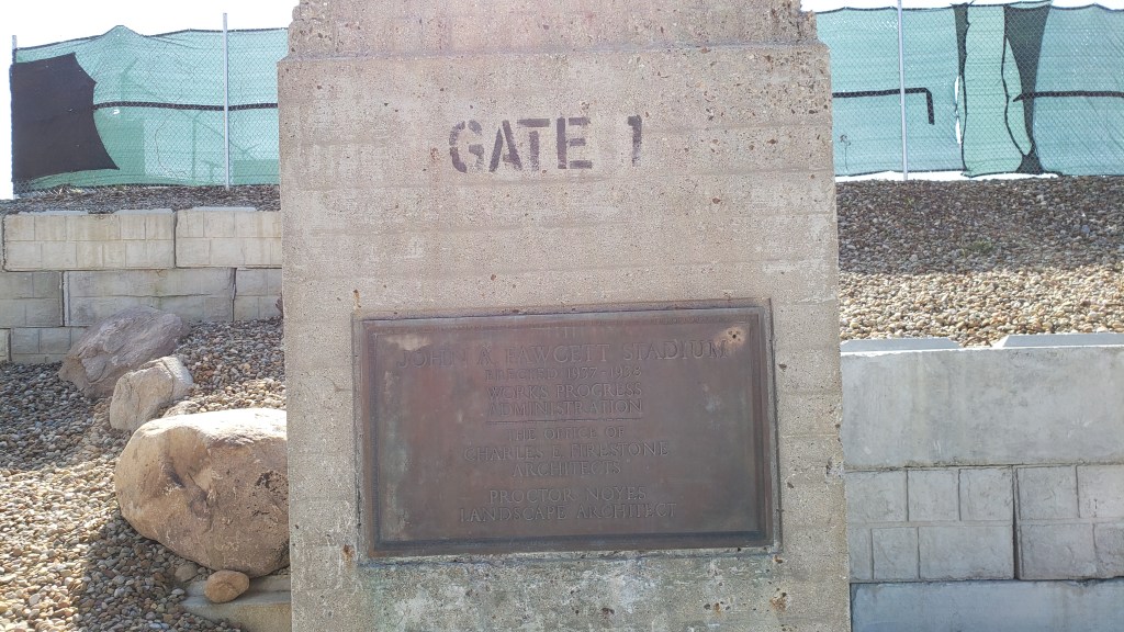 Near the main entrance, they’ve preserved an old “Gate 1” post and on it, is a worn plaque dedicating John A. Fawcett Stadium as part of the Works Progress Administration. The rest of the stadium, while beautiful, lacks character. I know that many different things go on here, but it would have been nice to see Hall of Fame stuff. Walsh clearly just borrows the stadium as they get no recognition at all. Behind the north end zone is a statue of Tom Benson, I think (there’s no name on it).