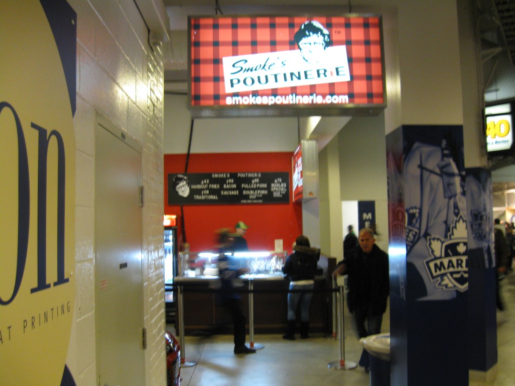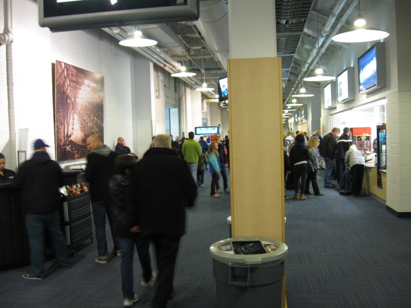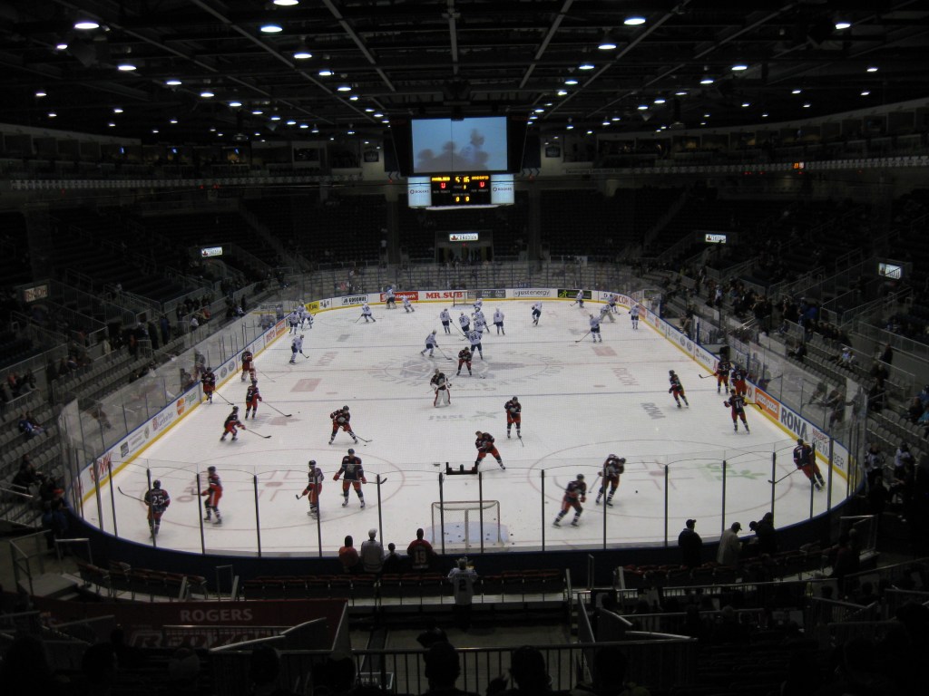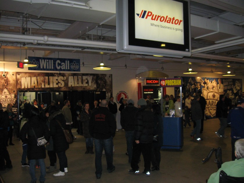 Here’s where the whole Leafs affiliation thing sucks. By far, this is the most expensive place in the AHL. I frown upon the tricky advertising the Marlies use as everywhere they market “Tickets as low as $10”. But those are just a tiny sliver of seats in the upper end rows. A side seat is either $31 or $39. Plus, day-of-game prices go up $4. Then, the parking is ridiculous as Exhibition Place is in charge of that department and we paid $15 for the underground lot, while other surface parking was $13 (websites didn’t indicate the different costs). Tax is included in the concessions, thus giving prices like $7.96 for turkey on rye. Hot Dogs were $4.25 and a chicken tender/fry combo was $8. It may not be close to a Leafs game, but the cost of attending the Marlies is not cheap.