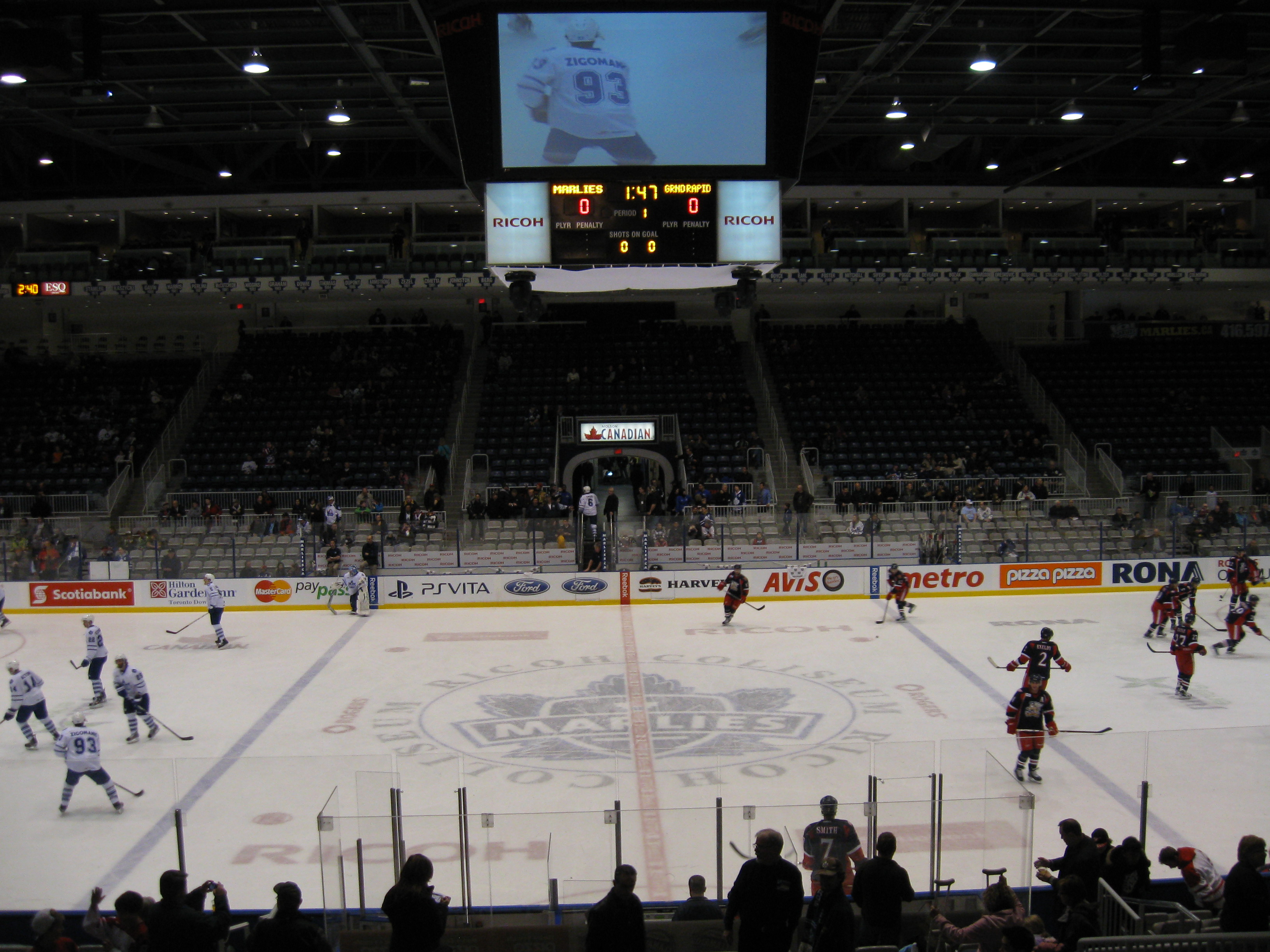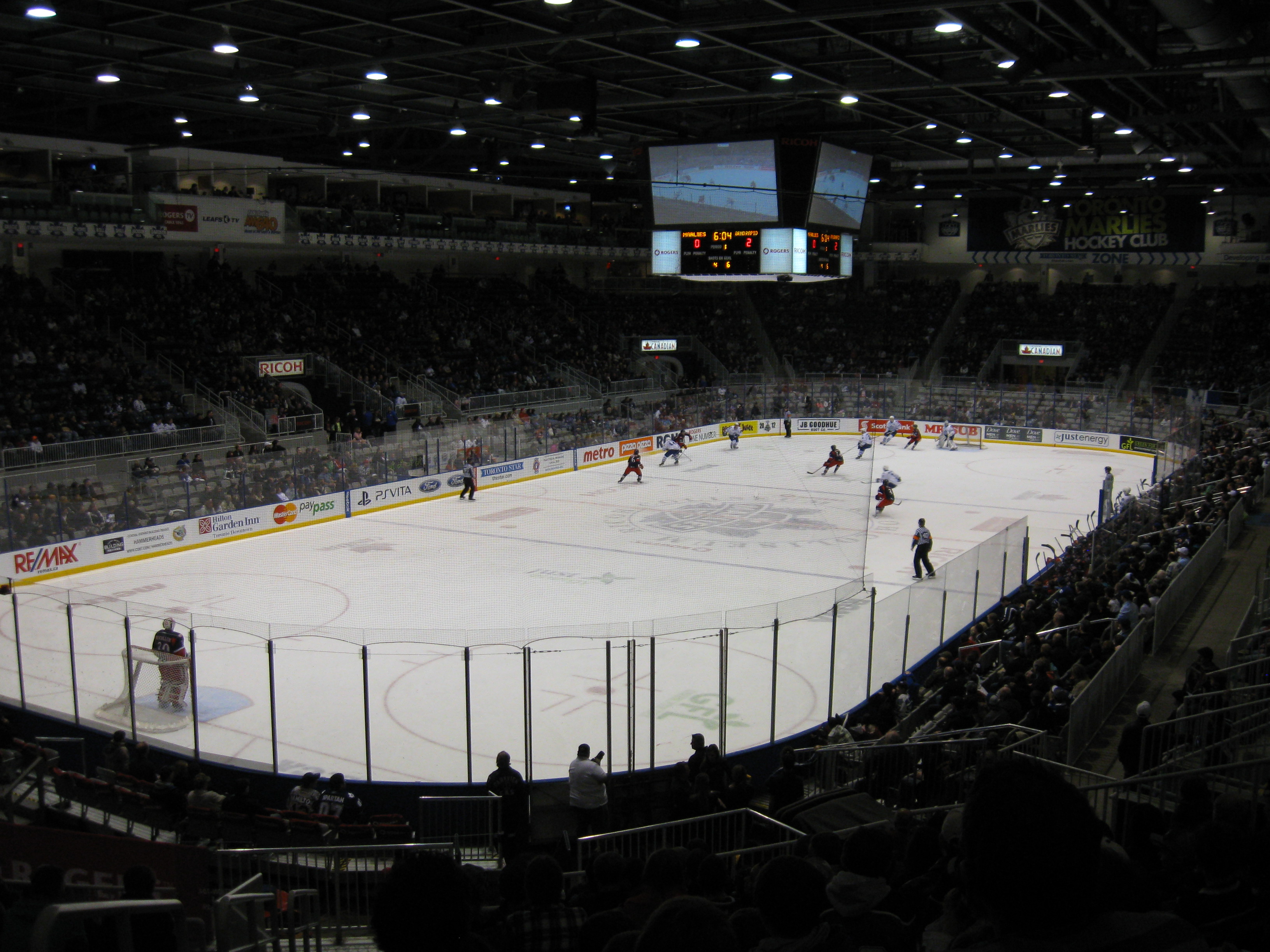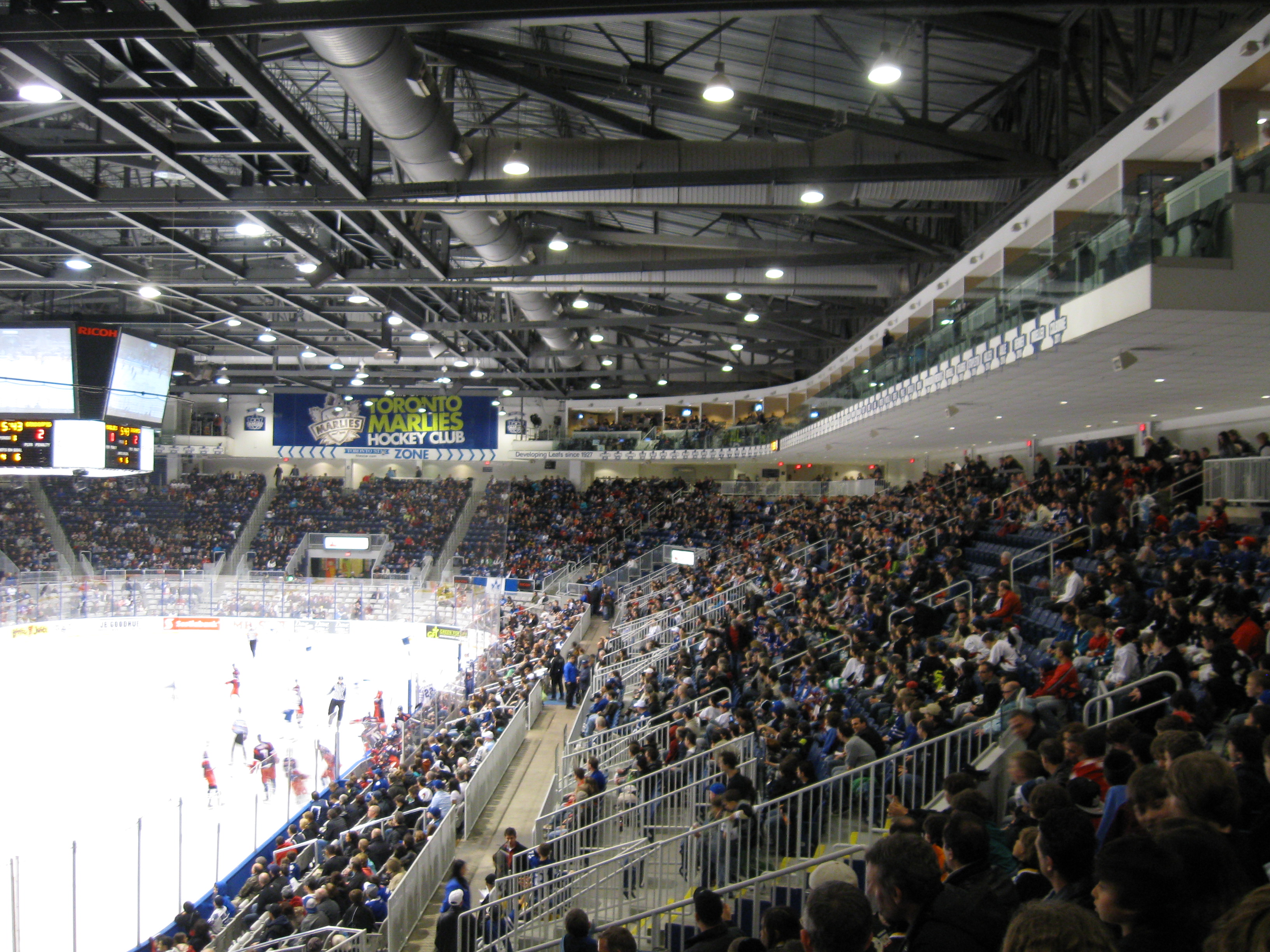 Here’s where the whole Leafs affiliation thing sucks. By far, this is the most expensive place in the AHL. I frown upon the tricky advertising the Marlies use as everywhere they market “Tickets as low as $10”. But those are just a tiny sliver of seats in the upper end rows. A side seat is either $31 or $39. Plus, day-of-game prices go up $4. Then, the parking is ridiculous as Exhibition Place is in charge of that department and we paid $15 for the underground lot, while other surface parking was $13 (websites didn’t indicate the different costs). Tax is included in the concessions, thus giving prices like $7.96 for turkey on rye. Hot Dogs were $4.25 and a chicken tender/fry combo was $8. It may not be close to a Leafs game, but the cost of attending the Marlies is not cheap.