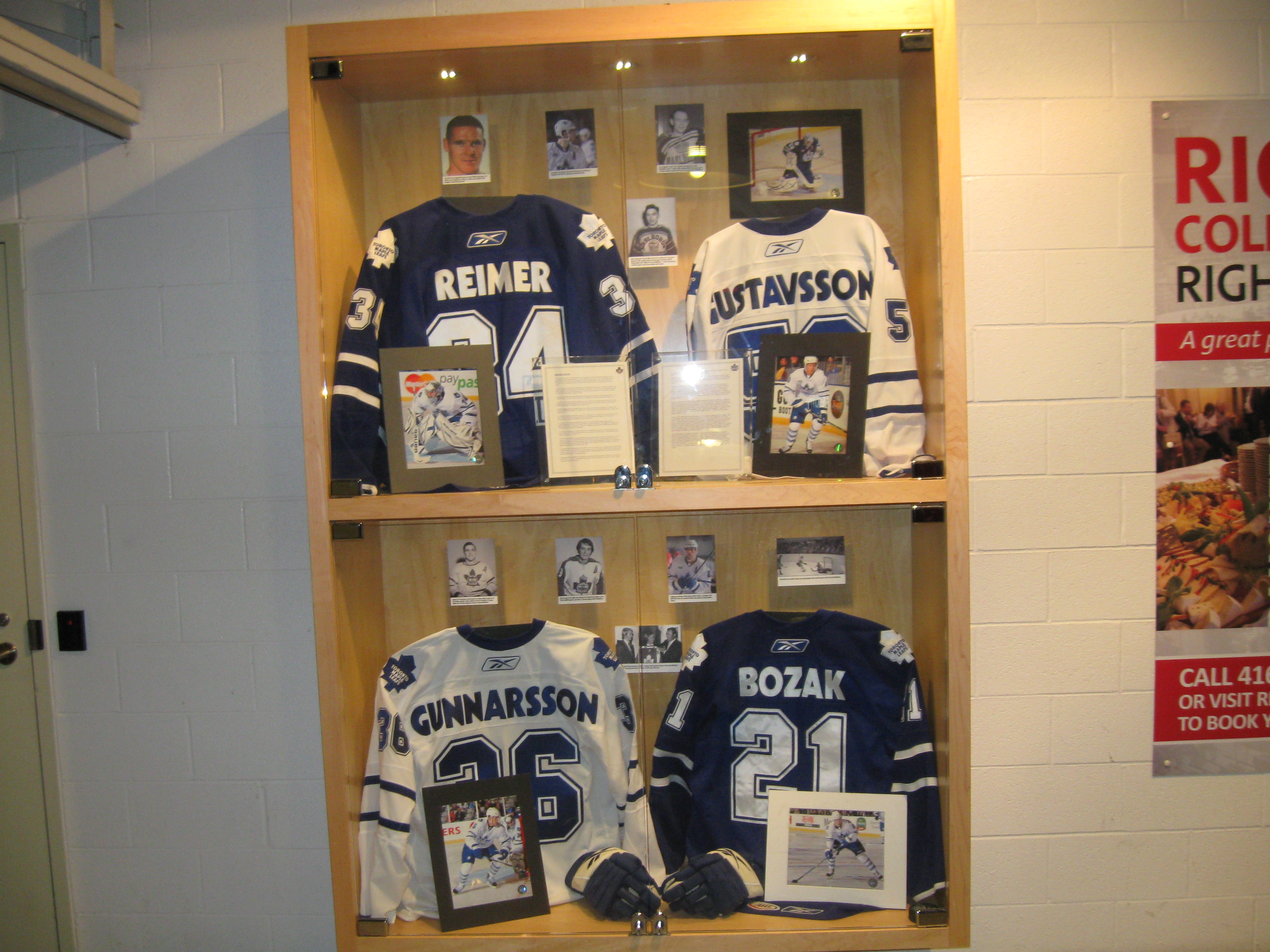 Ricoh Coliseum starts with a good impression by featuring posters on the walls when you walk in detailing the history of the arena. Further down in display cases are memorabilia from both the Marlies and the old junior Marlboros team. The concourses remain decorative with several old pictures on the walls, something I’m a sucker for. Not sure why they took down their division banners in the arena as the main focus inside is on the Leafs. On the wall below the suites are small Maple Leafs (Leaves?) with player name and year when they came into the NHL. The feature is called “Developing Leafs since 1927” and though there seem to be some big gaps in years, it isn’t a bad idea.