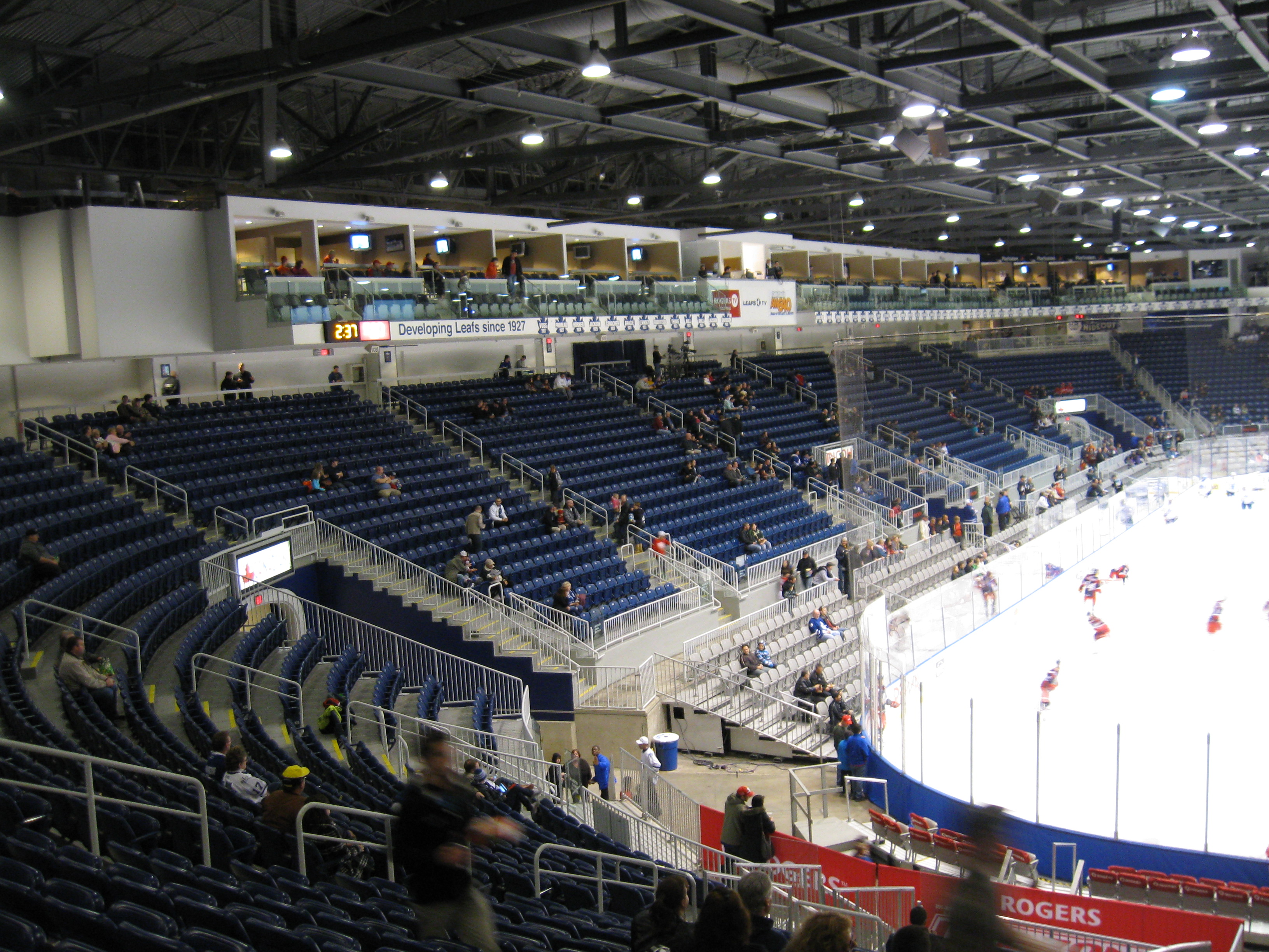 Aside from the surprise of seeing a newer interior design after the initial older introduction, there’s nothing overly exciting here. A one-level seating bowl circles the rink in a standard shape with a walkway set-up close to the glass. There is a lot of room behind the seating (especially at the west end) and that’s nice both for walking and watching the game as standing sections are available with a counter for leaning or resting drinks/food. One thing I noticed was how the openings to the concourse were quite expansive as they cut out a lot of the seats. Luxury suites are close to the low roof as they hang over the first 7-8 rows of the seating bowl. The other specialty area, Rogers Red Zone, is on the floor near one end of the ice. The red zone uses open space for getting a close view and allowing fans to sit at tables as they casually watch the game. Unfortunately, the red from both Rogers and Ricoh is out of place with the blue colored seats. Silver is the color of the seats below the lower walkway. You can feel that this arena was retrofitted.