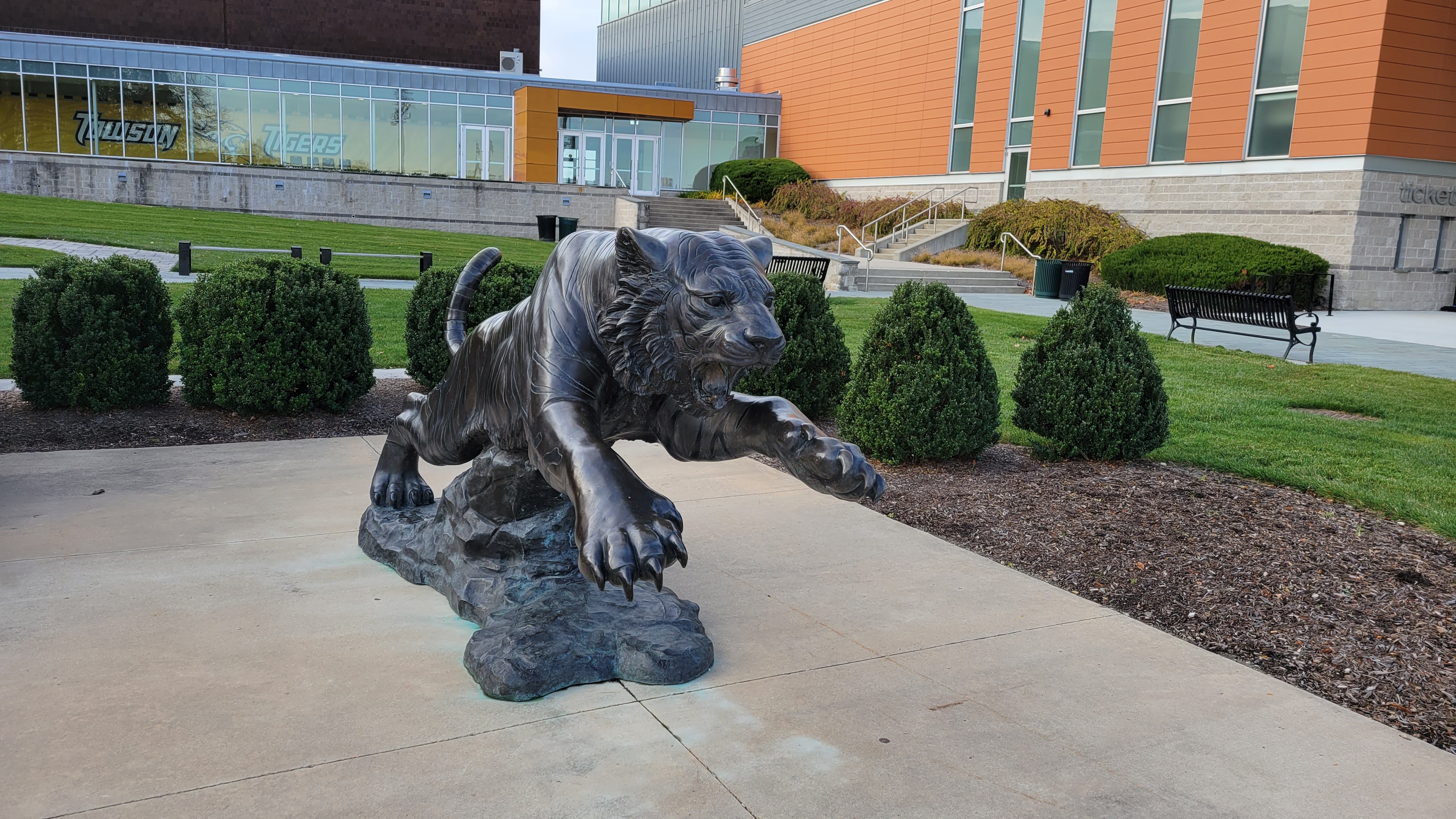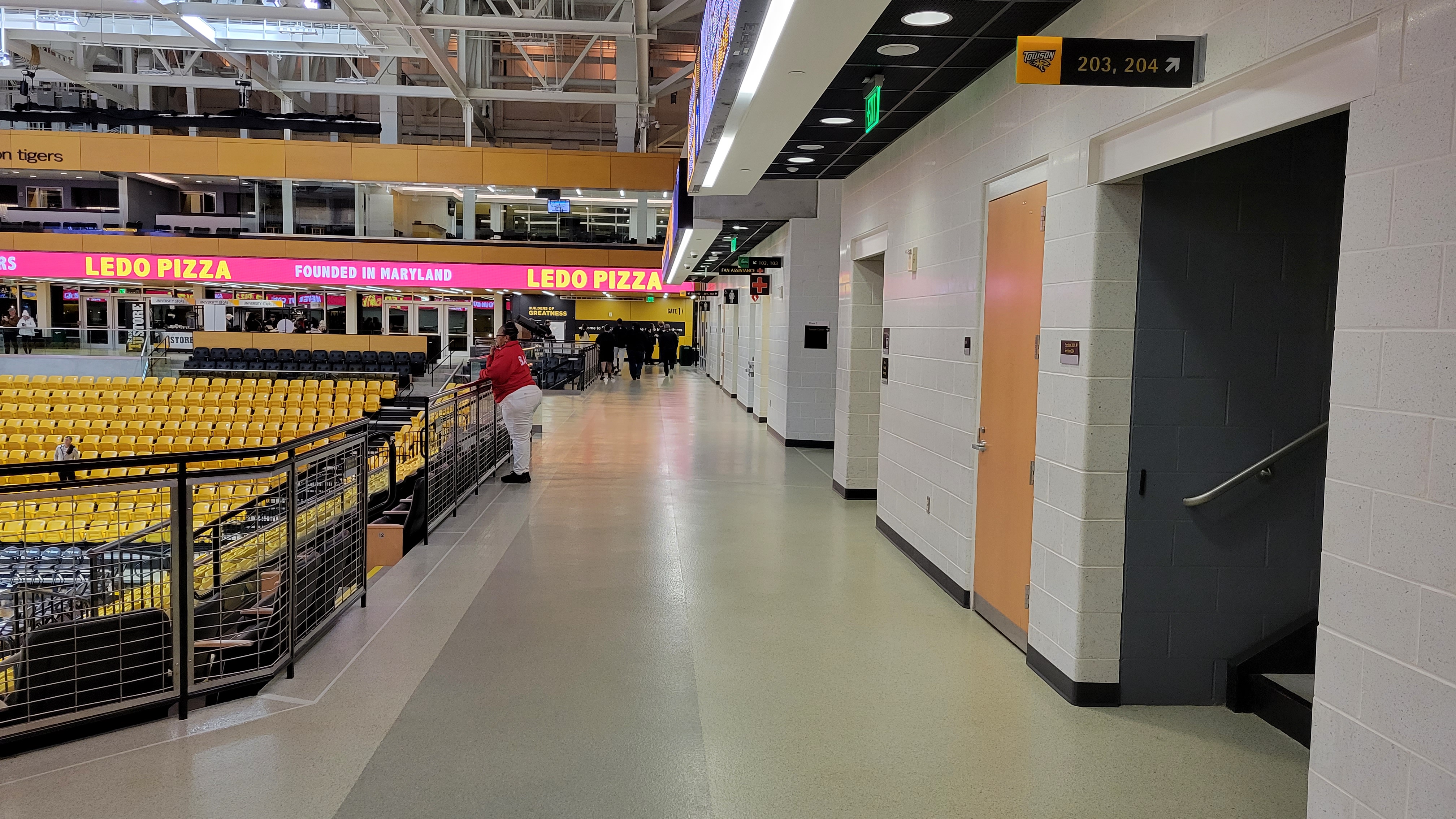 The banners on the wall above the upper bowl are extensive and honor each sport. For men’s basketball, you have the years for NCAA Tournament appearances, conference titles and NIT’s. You also have a 2012-13 banner for the largest single-season turnaround (what if that record gets broken?). The Tigers even have an NCAA Championship!……in Community Service. On the other hand, there is nothing else in the arena. Even if they don’t want to clutter up the walls around the walkway, they could use that aforementioned room with the alcohol and put some history in there, or at worst some pictures. Instead, you get cheap schedule posters placed haphazardly on the wall. At least outside the main entrance is an impressive Tiger statue that makes for a good meeting place or pre-game picture.