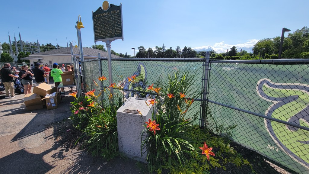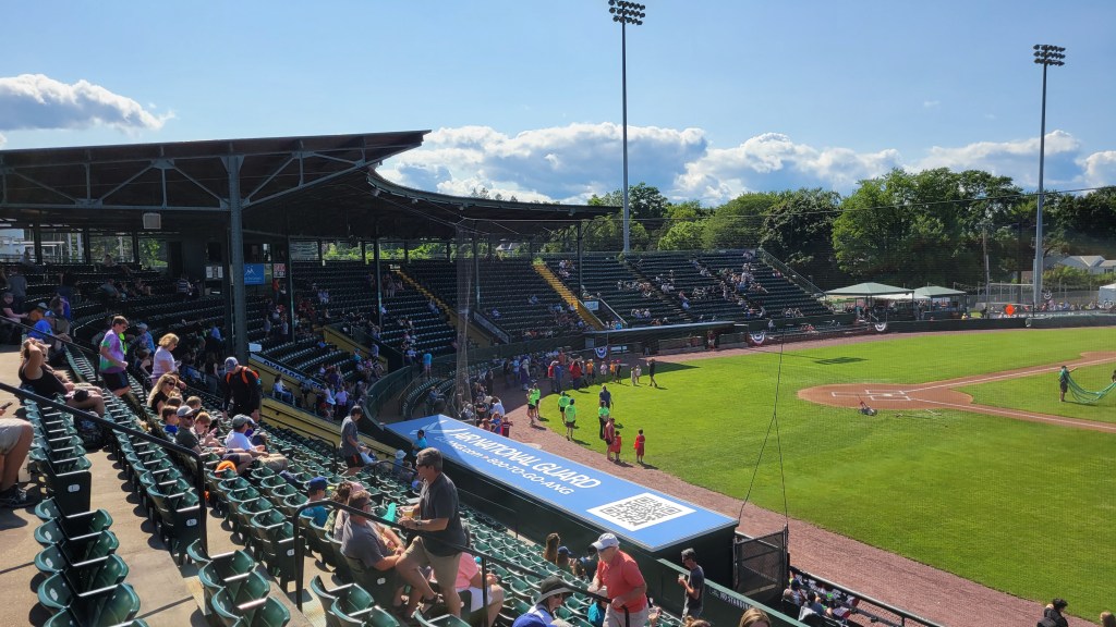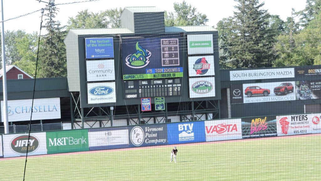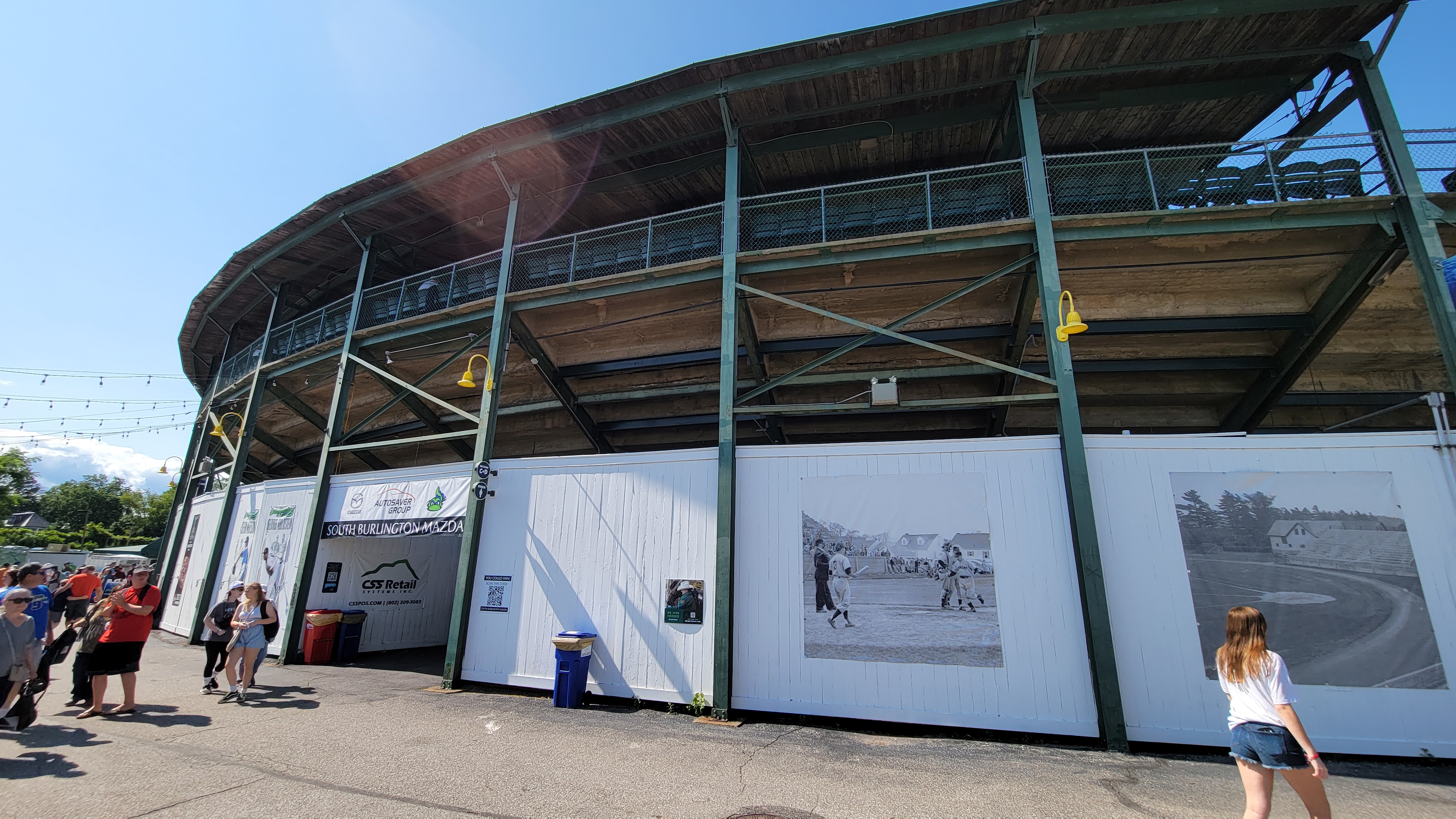 Ending up in Burlington on this Sunday was a long journey as rain-cancelled games in Massachusetts had me changing plans. I was happy for this detour as the city and ballpark were great places to visit. Despite a population of just 45,000, Burlington is the largest city in Vermont. This area in the northern part of the state is quite scenic as Burlington is on a hill next to Lake Champlain. There is still a free-spirit vibe around town and the area is popular with visitors. Professional baseball in the city was on and off until a team arrived in 1994 and became affiliated with the Montreal Expos. They won their only league championship in 1996. After a decade together, when the Expos moved to Washington, this Single-A squad turned into the Vermont Lake Monsters. That’s certainly a much better name as it played on the lore of what lurked in nearby Lake Champlain. The team became affiliated with Oakland in 2011, but sadly they were cut from the NY-Penn League during the restructuring of Minor League Baseball in 2021. Thankfully, the Lake Monsters found a home in the Futures League, a summer-collegiate wood bat outfit in New England made up of several teams that have had the same fate at some point in their past. Not much has changed as Vermont is doing well in the league and they continue play at their long-time home of Centennial Field. This current version of the stadium debuted in 1922 and thanks to recent renovations, it is a gem for watching the nation’s pastime.