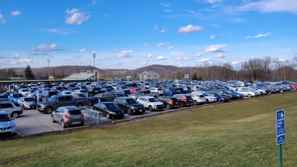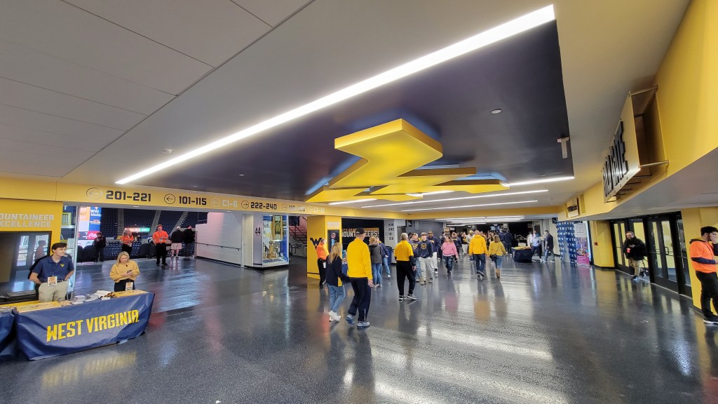 Morgantown is rural, but it’s only an hour or so down I-79 from Pittsburgh. Those coming from the east will use I-68 over the mountains. The town itself is full of hilly, winding streets, many of which are poorly designed and full of bumps. If you are just driving in and out for the game, that won’t be an issue because it’s one four lane road from I-79. What is a big issue is parking. The lots around the Coliseum are nowhere near enough for the capacity of the building, plus much of it is reserved for season pass holders. The limited cash-only / day-of-game space gets filled very quickly. It’s not exactly clear where to go thereafter. I suppose you could take a risk at a chain restaurant along Patteson Drive and then walk. Otherwise, the “overfill” lot is by the hospital and that is a 25-minute hilly walk away (plus shuttle buses aren’t running from there this season). It’s really crazy what little parking there is for an arena this size. Traffic post-game is a slog.