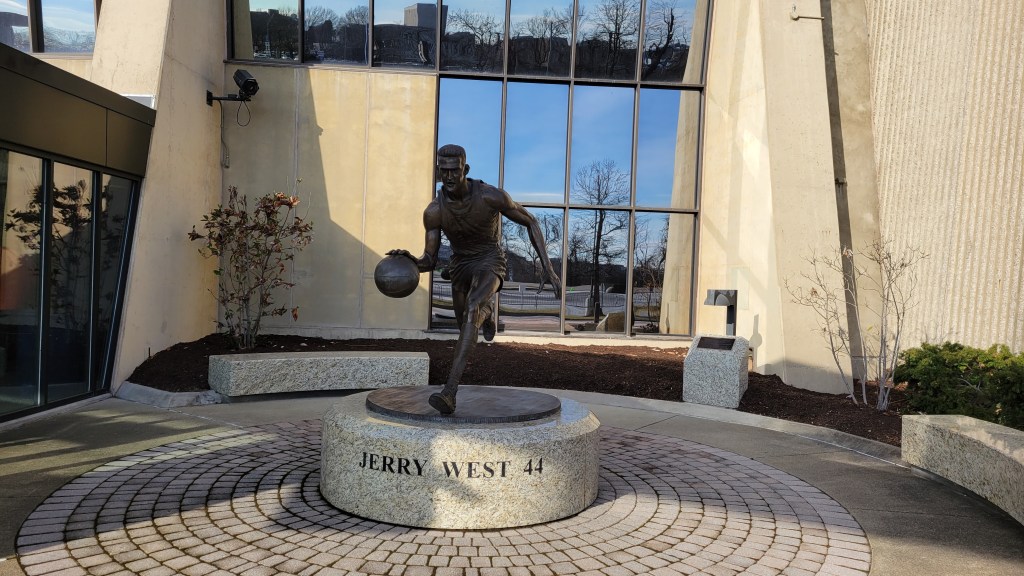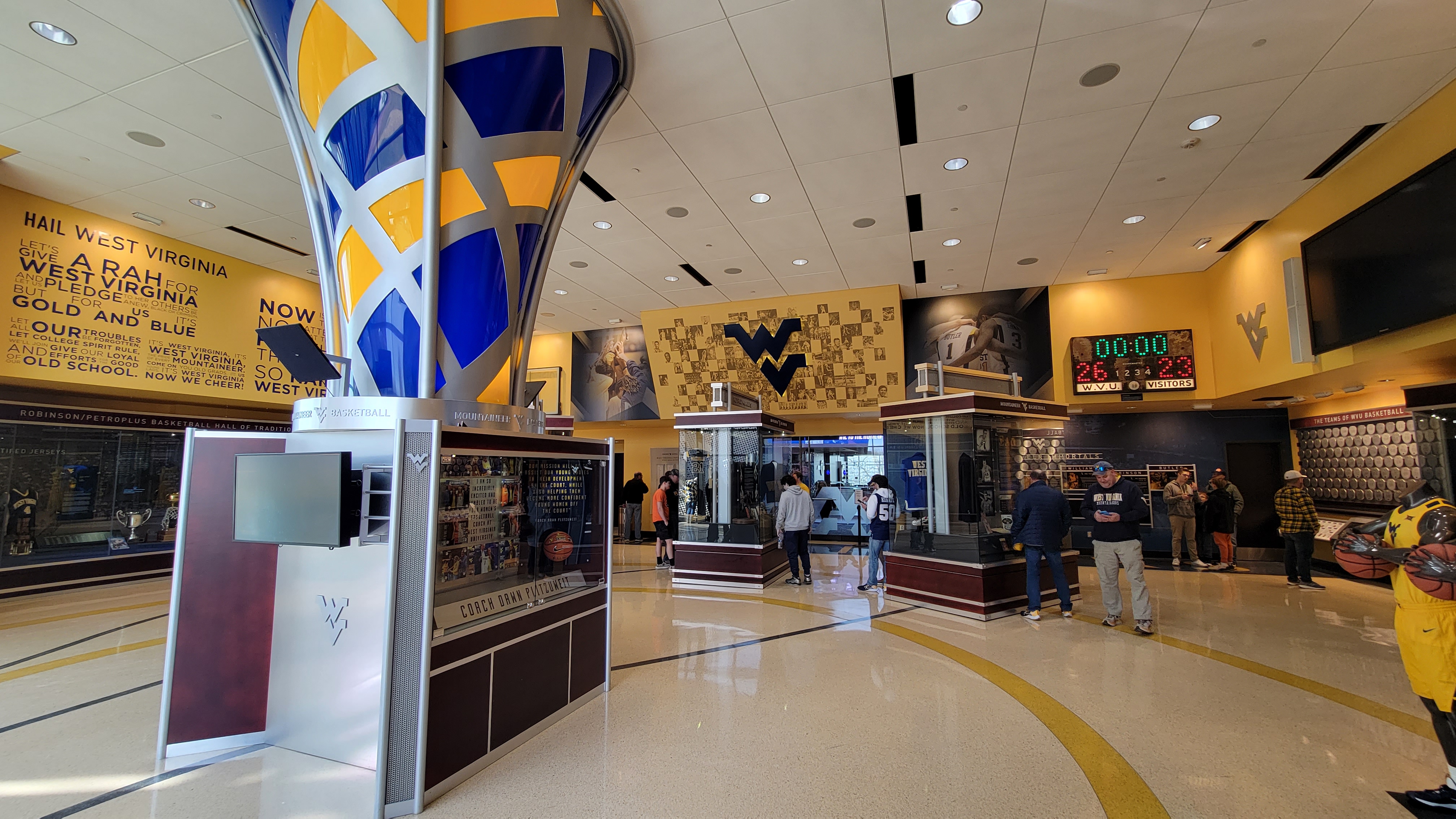 Outside the Coliseum, there are two statues: Hot Rod Huntley and Jerry West. Both have an inscription plate and in the concourse, there is more homage to West as a couple display cases show off his entire career to fans. You’ll see each of their retired numbers with a picture banner at the top of the arena wall in a corner (also there is a #44 for Rod Thorn). More of these types of displays are seen in other corners as they call it “Mountaineer Legends Society”. Team honors are found above the scoreboard (that’s how cavernous the building is) as skinny blue/gold banners honor NCAA Tournament achievements like Final Four and Sweet Sixteen appearances. Years that the team made the Tournament are on blue, wider banners.
