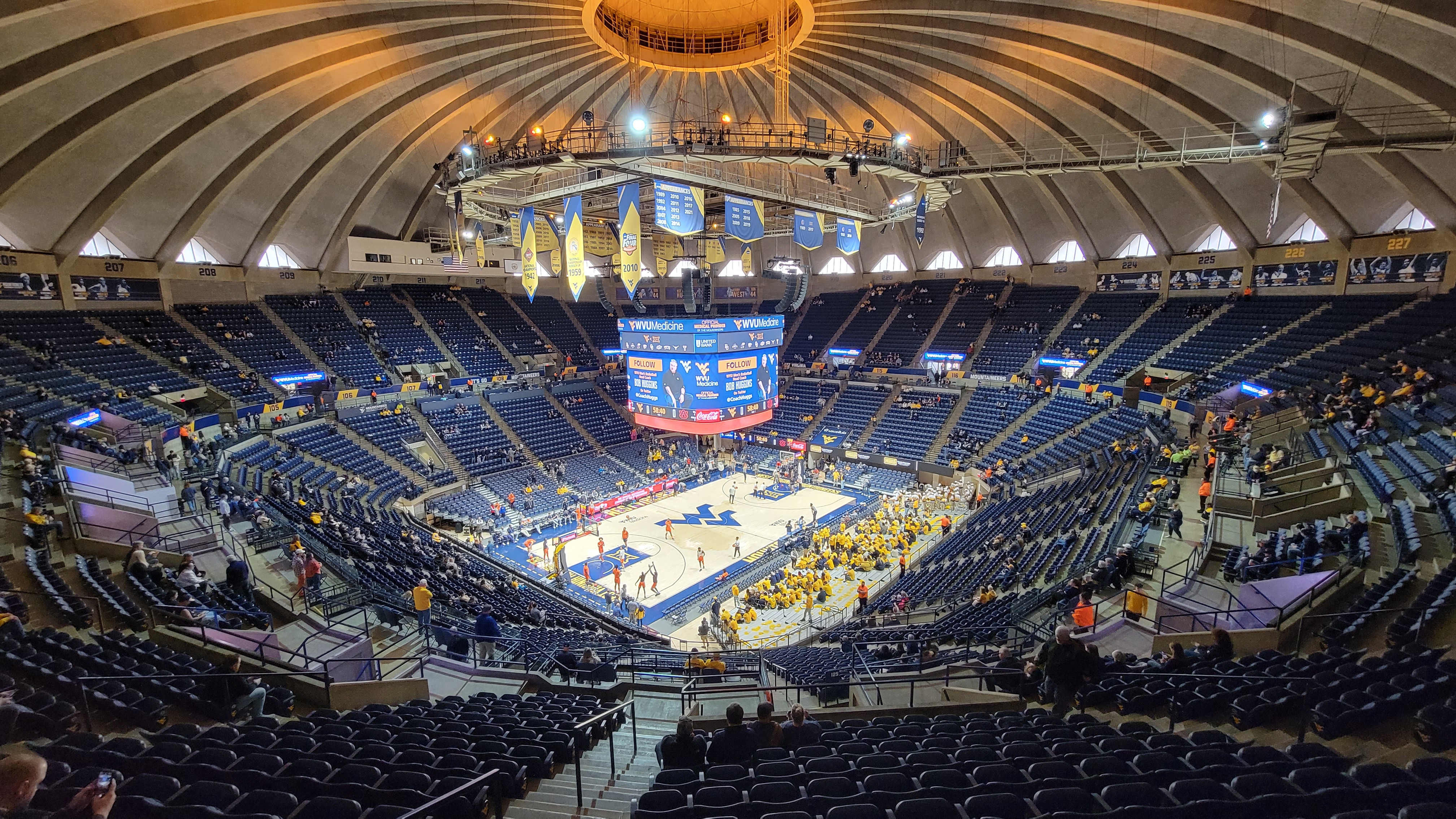 Before the game starts, there is a great tradition as the P.A. announces “Let’s roll out the carpet and greet the Mountaineers”. This goes back to 1955 as introduced players walk out on a Blue and Gold carpet. The 12 PM start time may have led to a sleepy crowd as they weren’t into it at the start. The music was blaring and the students were jumping, but there was a lack of energy from the rest of the house. That quickly changed. Each basket was met with abundant applause and key plays got louder as the half progressed. Mountaineer fans gave their team a thunderous ovation as they left the floor with a 17-point first half lead. One in-game tradition is the chant of “Let’s Go….Mountaineers” as one side says the beginning and the other says the end. It was half-hearted early on, then super loud by late in the game. I was thoroughly impressed when WVU’s lead shrunk to 6 or 7, the fans would clap and roar there team to not falter. The final minutes were quite loud, though because the arena is so cavernous, I wouldn’t call it deafening. Right after the final buzzer during a win is quite a tradition as there isn’t much time to celebrate (which is a little strange) because the lights go out and John Denver’s “Country Roads” plays. The Coliseum sings, students sway and goosebumps ensue for first timers. Most conference games are significant because it is the Big XII. Non-conference games are tamer, but still above average in terms of atmosphere across the NCAA Power 5 landscape. As for student section quality, the Mountaineer Maniacs are pretty good. They throw confetti after the first basket and have some organized chants. Lastly, be ready for the rifle that gets fired at the end of each half (it’s starting if you don’t know it’s coming)