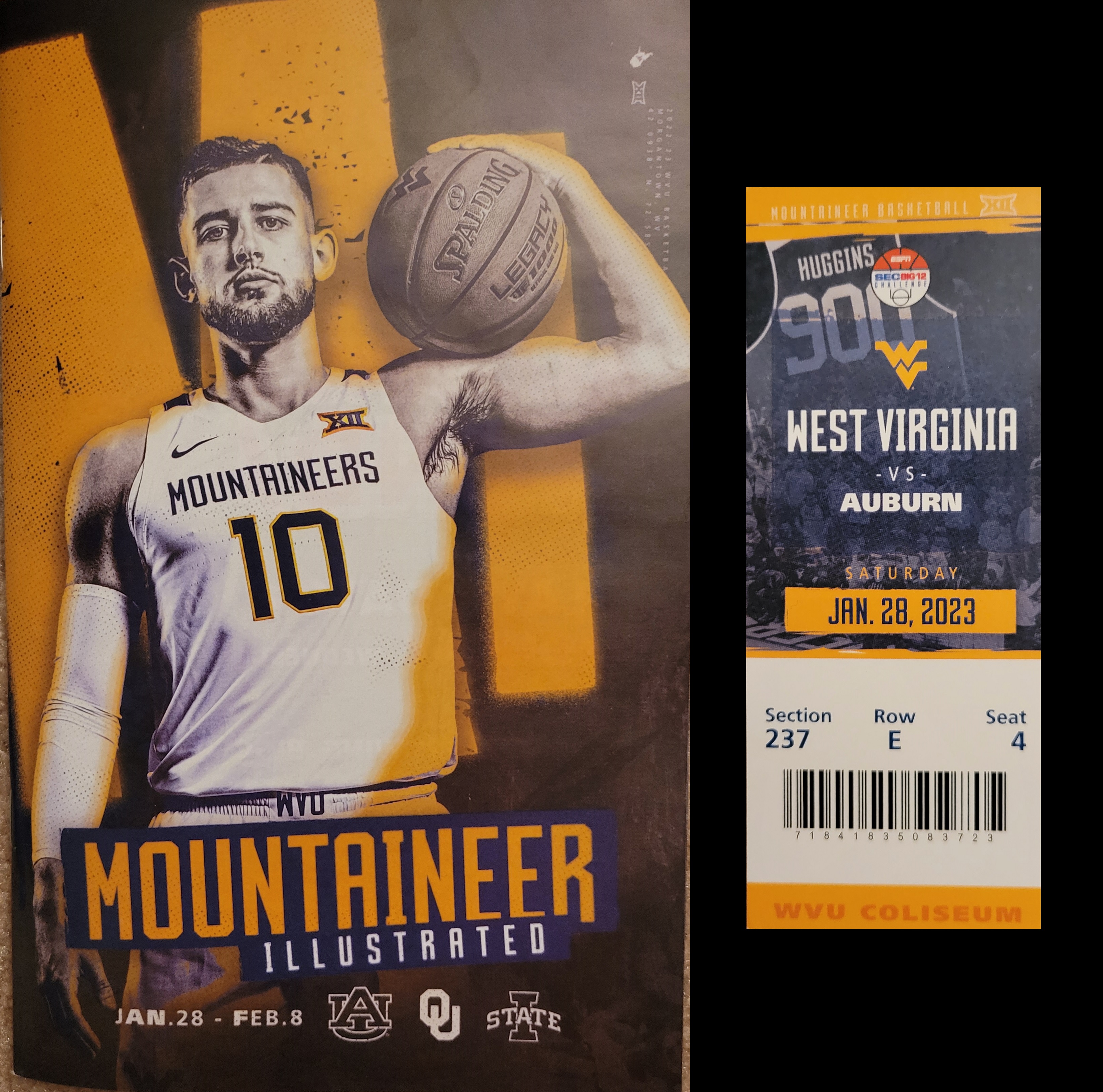 The Mountaineer mascot began appearing in the early 20th century and the tradition continues today with a student donning the buckskin uniform, coonskin hat and rifle. It is certainly a tremendous honor for each person…..West Virginia’s fiercest rival is the University of Pittsburgh in a game known as the Backyard Brawl. Conference realignment forced the series to go on hiatus until resuming in 2017 and it is back with a vengeance…..With Auburn in town, Bob Huggins held his annual Fish Fry fundraiser with Charles Barkley as a guest. It’s a tremendous event and $1.8 million was raised for cancer research and a Remember the Miners Scholars Program. Chuck was also at the game and got a nice ovation when they put his picture on the scoreboard…..Internet connection is not good in the building as I struggled to be able to check other game scores on my phone during TV timeouts.